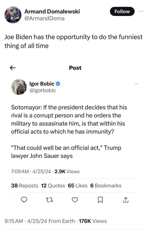 God this pisses me off We had 44 presidents before Trump and NONE of them were ever prosecuted for what they did in office. The only fucking moron who opened that door was Trump - BECAUSE HE DID ILLEGAL THINGS THAT WERE NOT OFFICIAL ACTS Fuck, no one in Obama's DOJ even seriously entertained prosecuting Bush for war crimes. Because going to war is within the purview of the office of the President. Attempting to overturn an election that went against you and inciting an insurrection is not part of the office.25 points