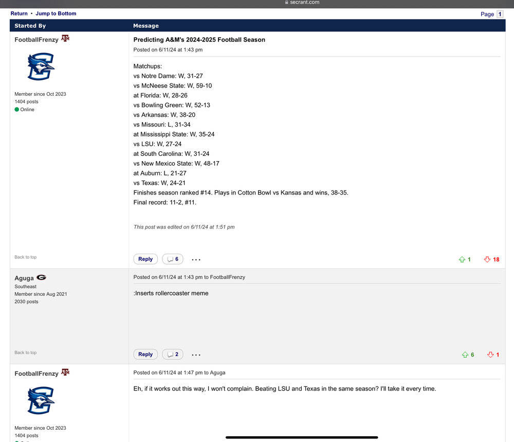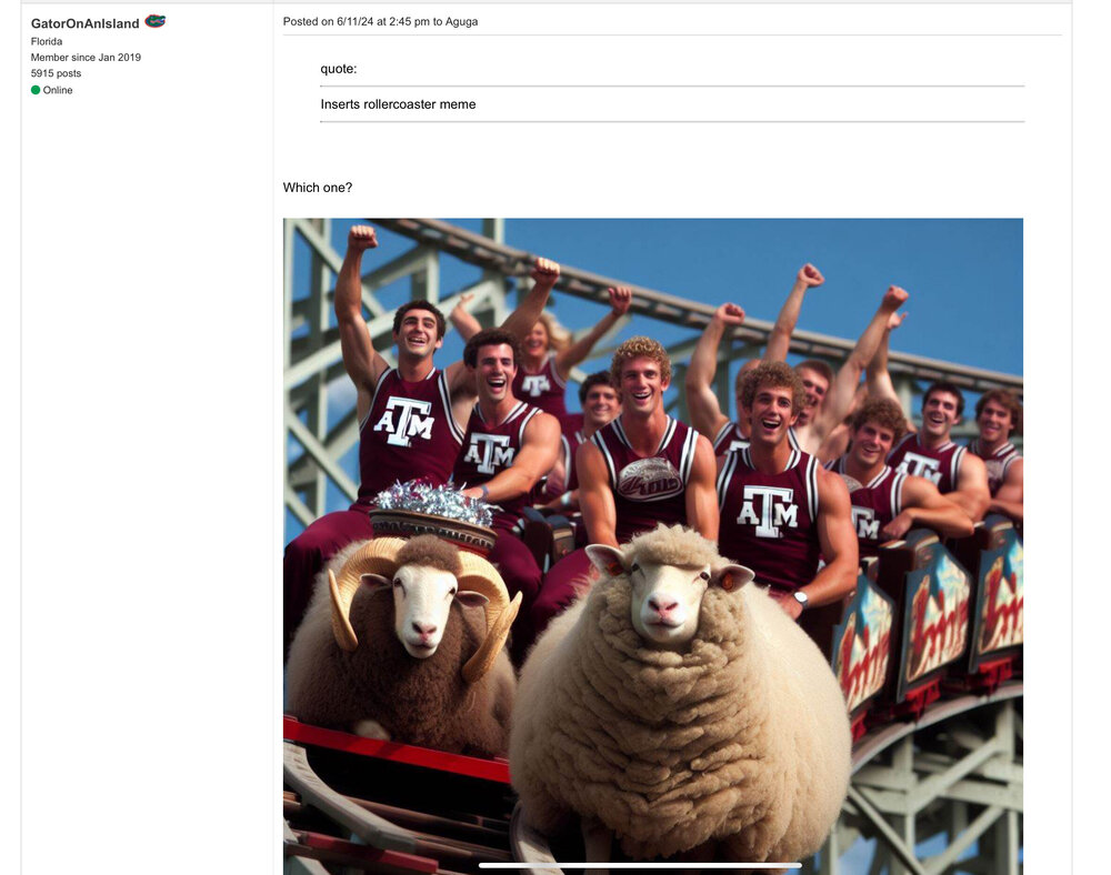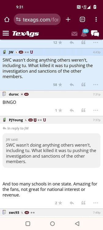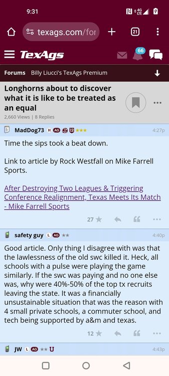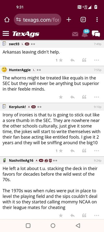 Rock Westfall Not a sleezy character. A journalist! Yes, both quotes do. The first represents the power of the Big Lie. The second quote shows, once again, the value of an A&M education and the way Aggies embrace their honor code. They've scored a little victory by irking me this morning. Texas held the Big 12 together after the cowardly departures of Nebraska and A&M. Colorado jumped out of FOMO. Missouri left because...who cares? The Big 12 was ruled by equal votes among the schools where A&M voted with Texas almost all the time. Nebraska's unfair advantages (unlimited non-qualifiers) were neutralized by votes where Nebraska was the lone dissenter as they were on votes about raising academic levels. In the SWC, Texas (DKR) introduced the idea of the entire conference sharing bowl revenue back when there were fewer bowls. A&M had larger recruiting classes than Texas did in the 1960s and still got dominated. Texas always included A&M in their plans. The news story is the insane jihad the Aggies have against ebil tu. They're all in on the liar cult. The quotes pretty much say it all, indeed.9 points