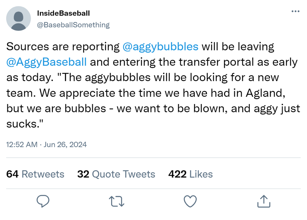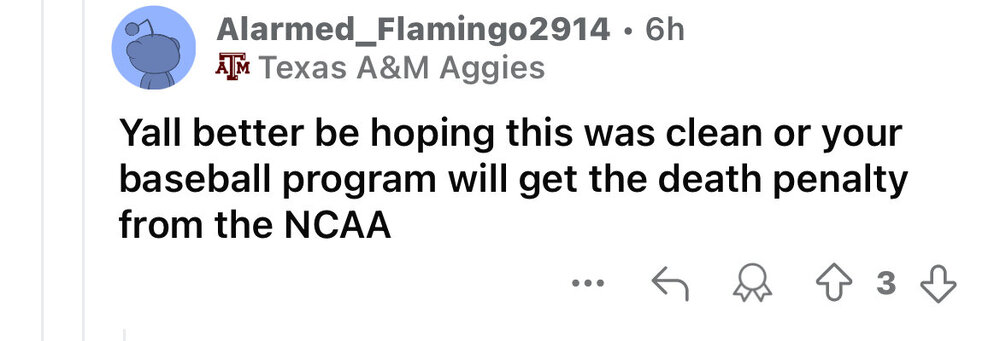 We really pillaged the entire A&M baseball program lol. Them boys got off the team bus after getting back from Omaha, high fived a bunch of A&M fans congratulating them, then all of them packed their shit for Texas. Not a single assistant stayed… I don’t think A&M has had a more sobering reality check in their history, and that is saying something28 points