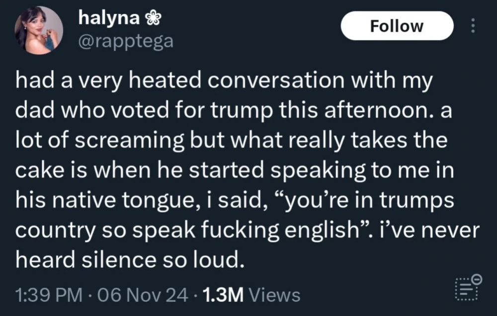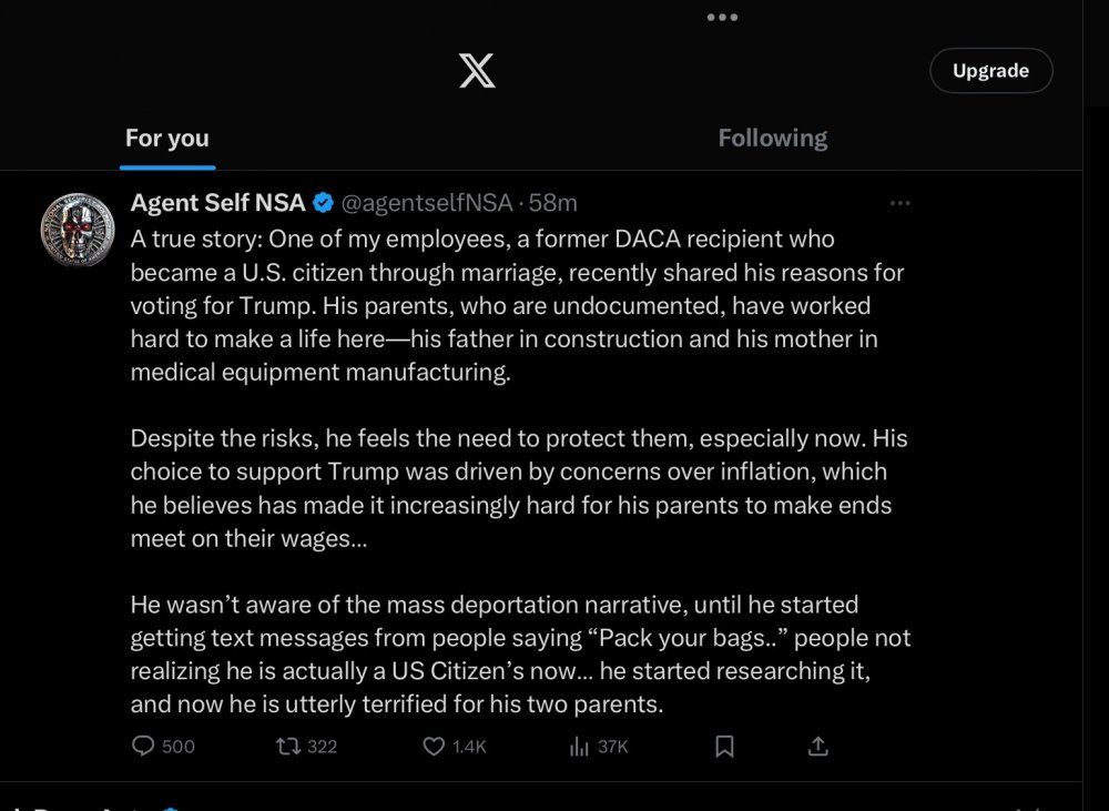 Had a fun run in today. Well not really fun. Sad. The interpreter I mentioned I was excited was going to vote called me. He voted Trump. Was rubbing my face in it. How he only supports winners, etc. So I let him go off until he says he is going to sponsor his Afghan parents to come to live with him. Um... I asked if he saw the statement about birthright citizenship. Nope. He says well at least they can come and visit. I asked what he thinks about a new Muslim ban. I am pretty sure Afghans will be added to any new list. Nope. He tells me he has to get a lot of work done on his truck (long haul trucker). I ask if he heard about tariffs and if he knew what components on his truck we made overseas. Nope. He says well at least the killing of Palestinians created by Biden will stop. I said if he knew it was Trump that moved the US Embassy to Jerusalem. Nope. He asked me to go to a gun show and help him pick something out since he is nervous in his neighborhood now (NE San Antonio, not Watts). I said nope. I hope he enjoys living under the Christian Taliban.24 points