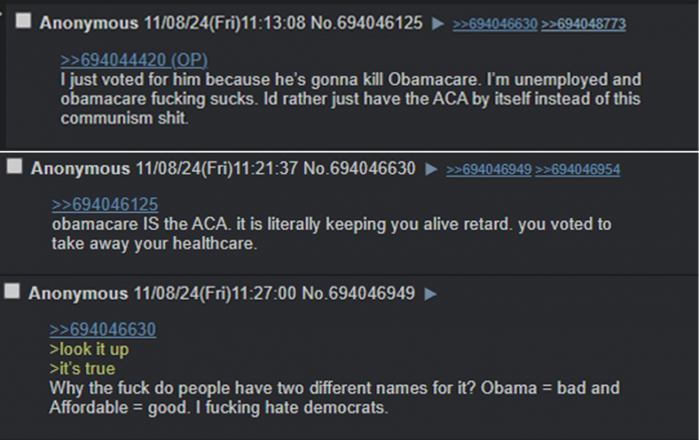I voted in a way that was against my self interest but which I thought was better for the country. I am now being laughed at and mocked by a bunch of online morons who probably aren't as well off as I am about how big daddy Trump is back and they love the taste of my tears. Excuse me for being a human and thinking "I tried my best bruh. Time for you to touch that hot stove and learn by experience. On you go."26 points