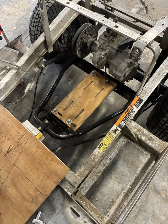I made a plywood motor mount to figure out the machining for the final plate. I need to shorten the crankshaft back to the taper adapter. I have a portable bandsaw that should make short work of that.