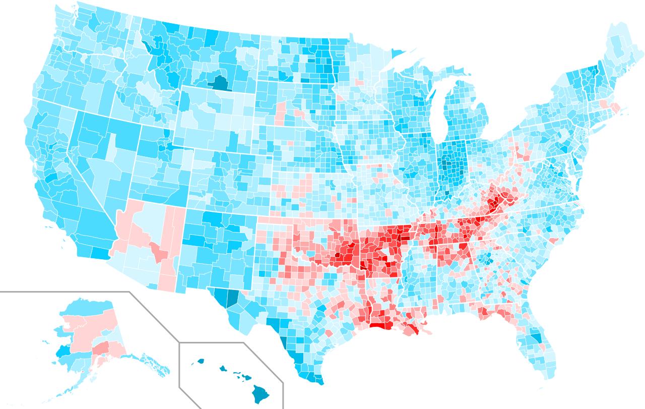 Well look, it’s a red state. But the idea that Texas won’t elect a black woman is as silly (and frankly as racist in it’s own self-defeating way) as the Clinton campaign’s implicit but very clear argument that America wouldn’t elect a black man in 2008. It would and did. And what happened? He flipped a number of Republican states blue and at pushed the vast majority of counties in America outside of Appalachia towards the Democratic Party, see image below. I remember phone banking for Obama and hearing stories from people calling Missouri and Southern Indiana and hearing people say they were going to “vote for the N-.” I’m never going to say that race and racism aren’t a major force in American politics, hsitory and culture. But good candidates and good campaigns can win anywhere, because winning defines “good.” Texas Democrats may have internalized victimhood, but Texas can be won.- Trump’s America