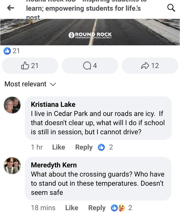 3. Yeah I’m thinking 80% chance RRISD closed tomorrow at this rate. It’ll have nothing to do with the roads, which are fine, but the cold + wind chill. Seems like an every year thing now. What I find bemusing is the constant chorus of folks (90% women) flooding the district FB pages with calls to cancel school the next day…citing everything from safety, to lack of proper clothing to crossing guards. One is a district TA, as if they didn’t just get 3 straight weeks off + a long weekend If you feel that strongly just keep your damn kids home and take the unexcused absence. The rest of us have to work and don’t want to do it with the kiddos running around all day.