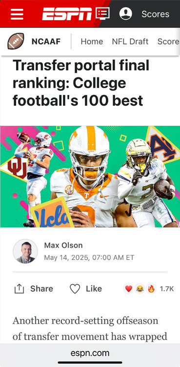 9. In other news… ESPN thinks that our incoming transfer class is chopped liver!! https://www.espn.com/college-football/story/_/id/45112485/college-football-transfer-portal-final-ranking-100-best You won’t believe how far down you have to scroll to find our “best” portal newcomer, nor will you believe how many of our incoming transfers make the Top 100! 👆Clickbait comment