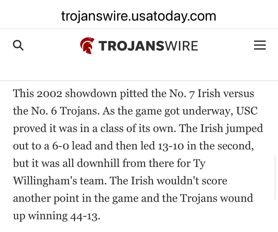 6. COOL STORY BRO: One of my best friends since kindergarten (Vandy alum) and I went to the 2002 matchup in the LA Coliseum that basically won Carson Palmer the Heisman. “Carson Palmer's performance was one for the ages. He threw for 425 yards and four touchdowns. The Trojan defense held the Irish to just 109 total yards. USC managed to post 610 total yards of offense. USC phenom Mike Williams starred at wide receiver -- he caught 10 passes for 169 yards and two touchdowns. Running back Justin Fargas* ran for 120 yards on 20 carries and added another four catches for 41 yards. Even the fullback, Malaefou MacKenzie, got in on the action by catching two touchdown passes.” https://trojanswire.usatoday.com/story/sports/college/trojans/football/2020/11/28/looking-back-at-usc-2002-game-versus-notre-dame-trojans-football-carson-palmer-heisman-trophy/79215386007/# *Fargas was/is the son of TV’s “Huggy Bear” from the “Starsky & Hutch” television show. Antonio Fargas