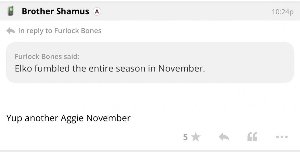 16. This!!!!! Aggie logic at its finest on display. “All Jimbo needed was another couple of years to turn this around. He was stacked, won the ACC twice and had won a Natty!” Inject this into my veins!!!!