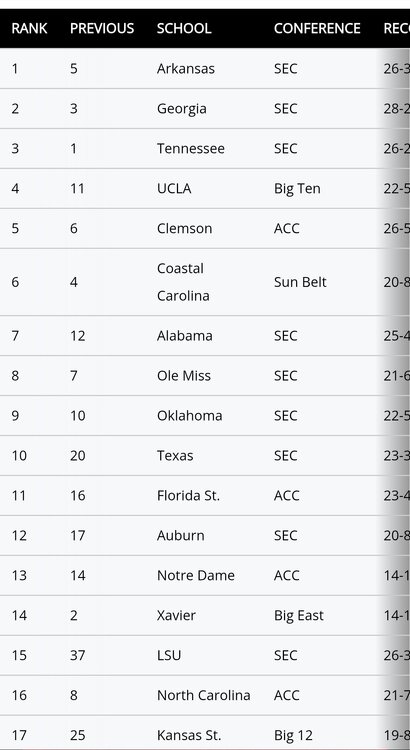 3. Updated Rankings First, Texas rankings: Baseball America https://www.baseballamerica.com/stories/college-baseball-top-25-rankings/ D1 Baseball https://www.ncaa.com/rankings/baseball/d1/d1baseballcom-top-25 Perfect Game https://www.perfectgame.org/Articles/View.aspx?article=23533 USA Today Coaches Poll https://sportsdata.usatoday.com/baseball/cbb/coaches-poll NCBWA https://www.sportswriters.net/ncbwa/news/2025/03/31/tennessee-26-2-tops-ncbwa-division-i-poll Tennessee is the unanimous #1 with Arkansas, Texas, Georgia, LSU, Clemson, and Florida State generally making up the top 5 ish.