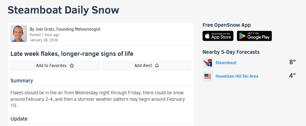 I took the plunge on President's day weekend at Steamboat today. Here's to hoping the stormier pattern materializes before then... OpenSnowSteamboat Daily Snow Forecast | OpenSnowThe Steamboat Daily Snow provides the best snow forecast, written by a local Steamboat forecaster. Find snow conditions at ski resorts in Steamboat.- Hey Oil Barons.......
