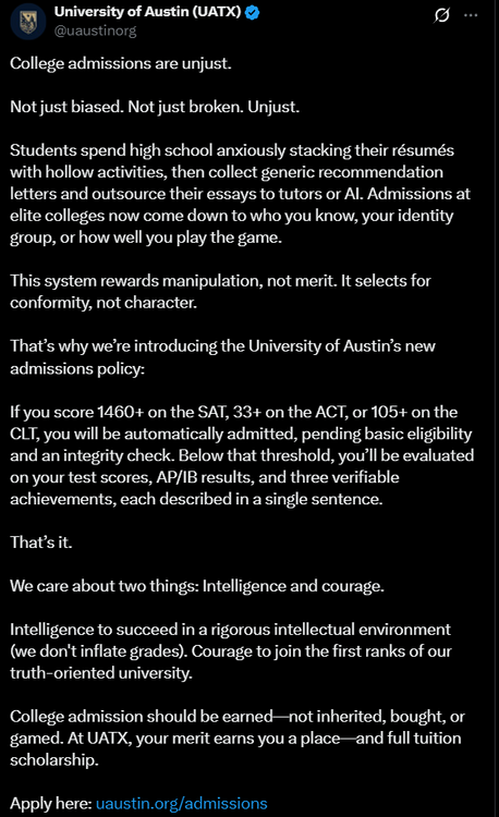 11. That's a pretty low brow reaction. Do you have any kids applying for college in the next couple years and see the apps they are trying to build for schools like UT? This shit is crazy. Maybe you do maybe you don't. But your response doesn't particularly suggest to me that you see the current college application system with any contrast to what most of us went through in our own experiences (certainly assumptions baked in here). I don't think that reduction to standardized testing is the answer. But the system is very broken man.