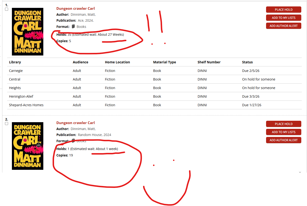 I just don't have much bandwidth for listening to books. Currently the act of reading is as important to me was what I'm reading, for brain and mental health, etc. I've still got like 40 episodes of Last Podcast On The Left I'm cycling through (been like a 5 year commitment there) that I listen to when I'm in my short commutes every day, so that's out. Maybe when I'm done with that. Man. Dresden files are very meh so far. The stories are fine, but the guy is a poor writer. The problem is I read book one. I now....have to fucking finish like all 18. Those are the rules. But I am NOT excited about it. So the Houston public library has a couple copies of Dungeon Crawler Carl. One of them has a 27 week wait list. The other has almost no waitlist. People are...not always smart.