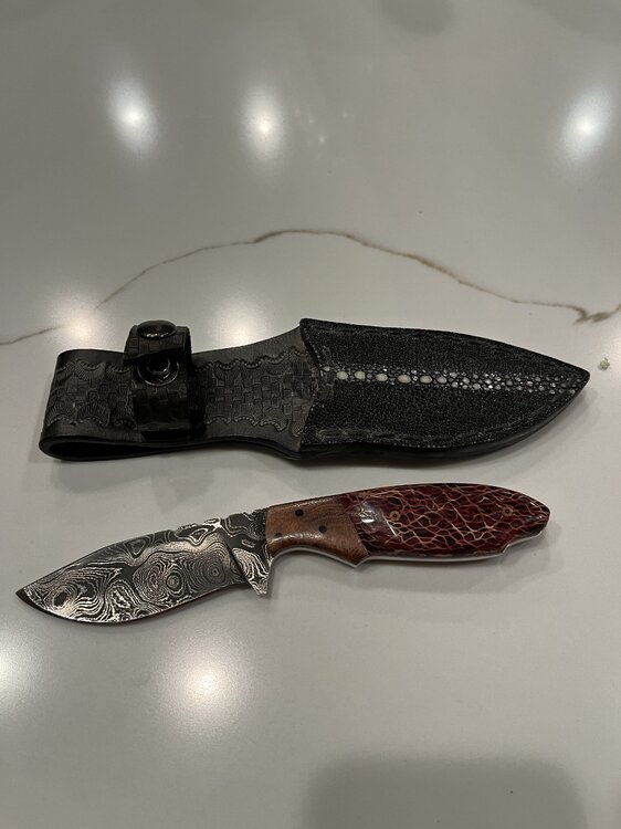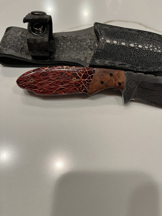 7. I really like the damascus material. My wife bought me a custom damascus fixed blade with Texas prickly pear scales, it’s pretty cool. I will post a picture in just a few. I really don’t want to edc it though. Here it is. Cactus and mesquite with the damascus, not sure if this guy makes his own damascus or just buys it. He’s here in Texas https://chopsknives.com/portfolio
