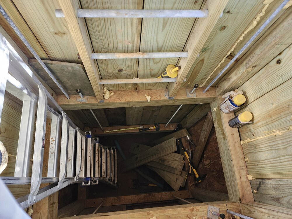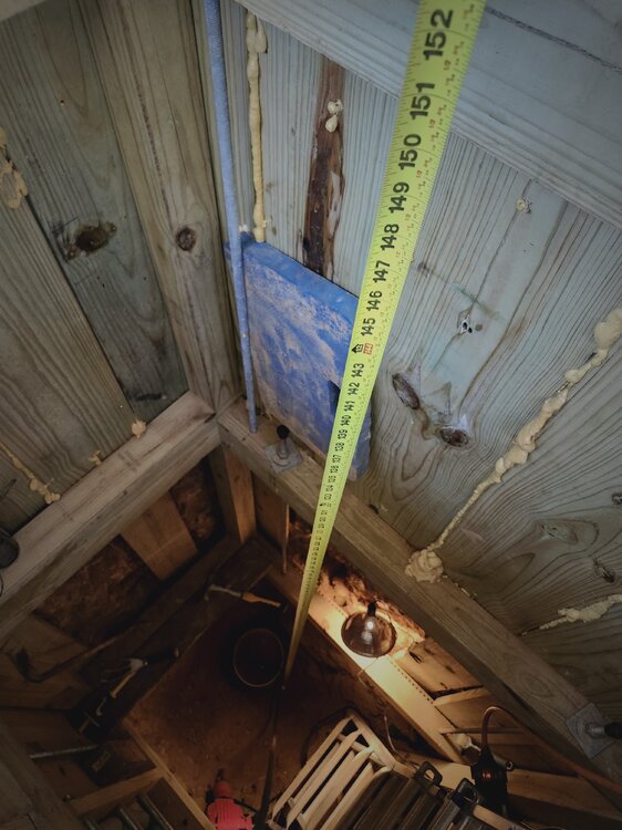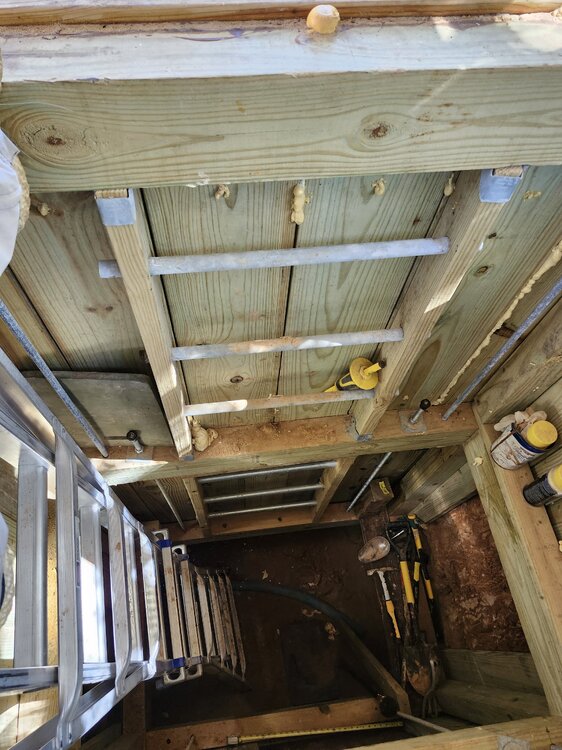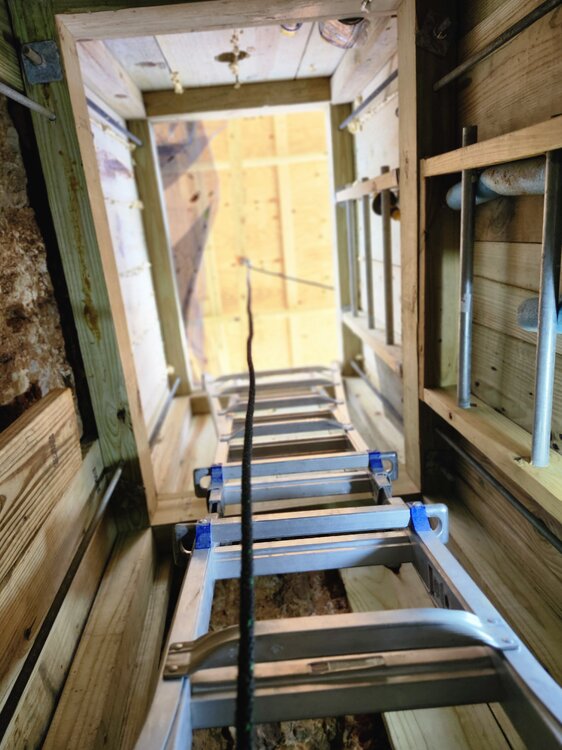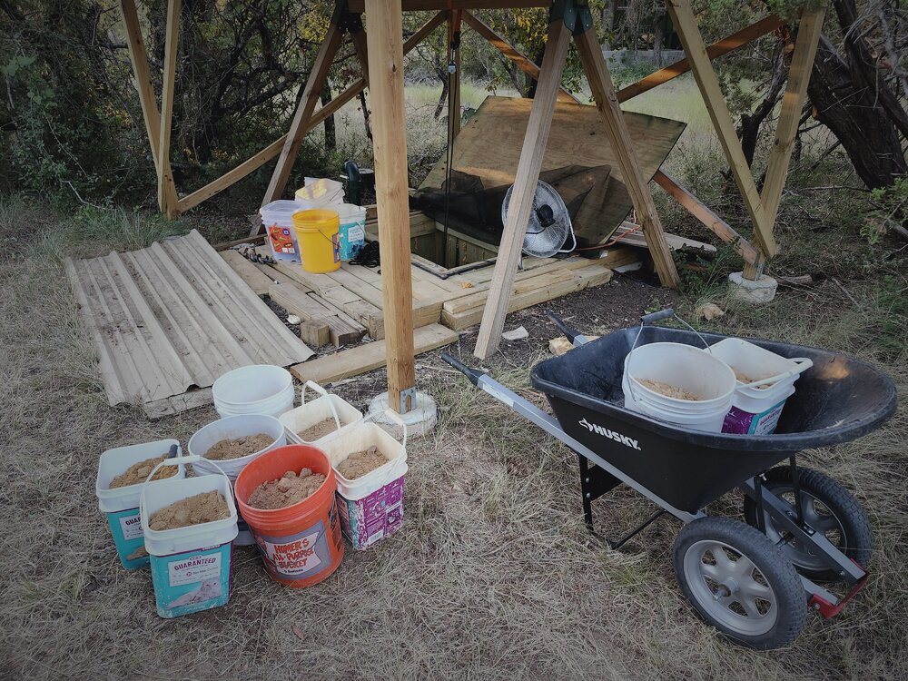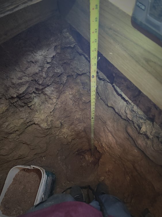 • Inside is 30"x48" made of 4x6s and 2x walls • currently about 11.5' • it is a little bit cooler/warmer or at least the air isn't • it takes a little bit to carefully climb ladder. I haul up buckets with a pully • I used an electric jackhammer if it's. shelf of rock. Otherwise a 48" bully digger, rock hammer, and chisel. I have a metal dog food scoop that is good for loose stuff. A hand garden fork is good for scraping walls. A couple of padded gardening kneeleres are nice. I have a 36" crowbar which is good in tight space. Two small shivers, one a round and the other a transfer shovel. • jack hammer comes out. Usually I leave the other stuff. • Sometimes a big piece of 3/4 ply covers it (atop some extra 4x4 pieces. I roll screen mesh over to try and keep bugs and frogs out. It's about a quarter mile from the road, and it was a wet May, so O let it air out this past couple of months. • Any larger and I'd need to divide the compartment in half or use 6x6s as the main framing. • Mrs doesn't mind. I come back happier amd less stressed. • I want to do at least 4 sets if 4' sections, maybe 5. I figure go down to 20 or 22 and then think about going sideways. I'd like to get deep enough and from there frame up amd pour concrete in lifts, building from the bottom up. I could remove sections. The wood is pressure treated, but it wont last forever. Maybe I'll even source basalt rebar. You need 2.5x tunnel height in overburden. So a 4' tunnel would need 10' (14 total), 5' = 17.5, and 6' = 21'. Six ft is probably overkill, but might be nice to have the option. Amd of course when I go sideways... mine cart tracks! • I'd go out the 48" side away from the road. Pretty much the only way to go. But I could put another hole after a ways!