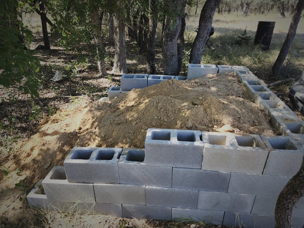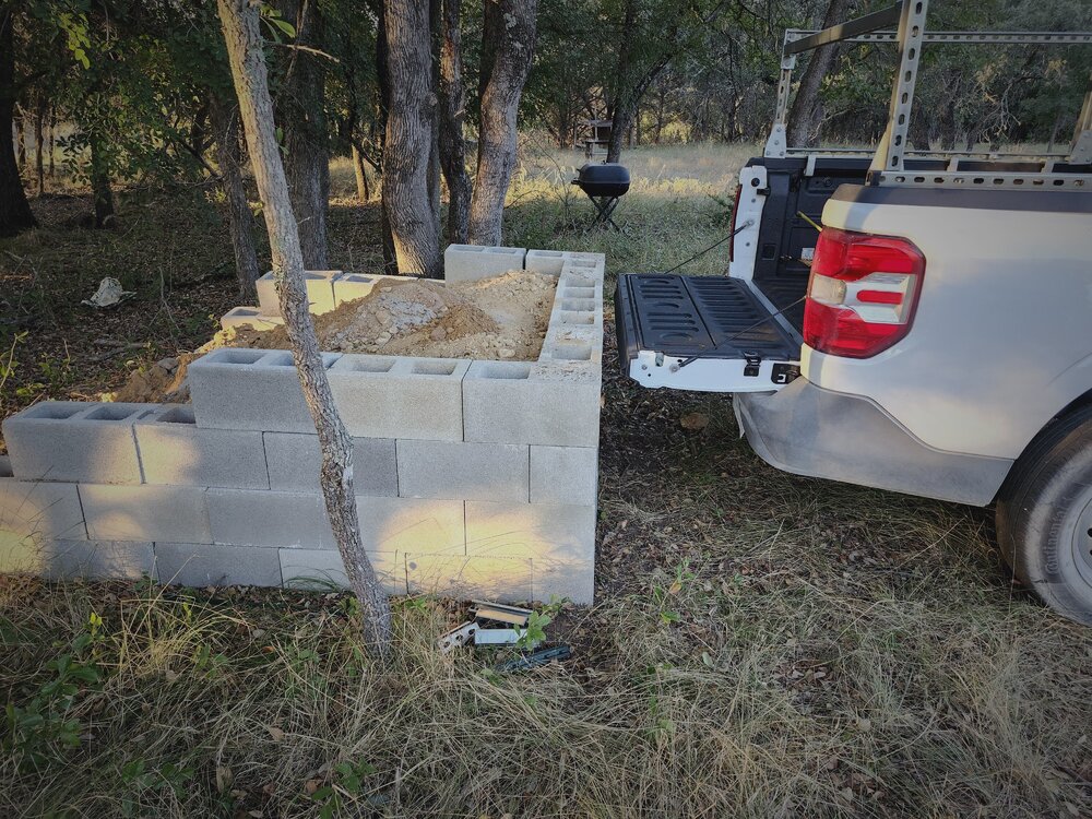 Went up Saturday night, got things ready (ran the extension cord, put up work light, set up pully, let down jackhammer, set up a fan). Got an early start Sunday. Worked pretty hard, 630 to 1130. About my limit. Got out 32 buckets of dirt/rocks, and another 6 buckets of just rocks. Hand clenched up for a good 5 minutes after the 40th or so 12' haul of ~40 lb of stuff. So now one side is down to 13'. I still need to get the sides straight, and realistically that's a whole trip right there. I want to get a more portable rock hammer. I think it would make chiseling out the rocky layers easier. Once I clean up that side (space enough for the 4x6 and the 2x shoring - leaving 48x30" ID clear), I can turn the ladder around, and probably raise it a rung or two. Once I get the other side down to 13' it will be time for another set of shoring. I've got the big lumber, but I need 4x 5/8 60" threaded rod, and some angled slot (holds up the 2x lagging). I still have a little lagging I need to finish up and the second level. I like to buy the next set of 4x6 so I can drill the proper 3/4 holes so that they line up well. The rod is pretty forgiving honestly - thank goodness because even with a manual drill press my holes aren't perfectly straight down. People asked about what I do with the dirt. It is an issue! Sometimes I separate the rocks a bit, and use them for erosion control around the ranch. I have an old pile of dirt from when I started. The hole is in the background. A while ago I decided to make use of the dirt. So I stacked some concrete blocks and am making a ramp for the pickup. That way I can load a tiller or whatever a little easier.