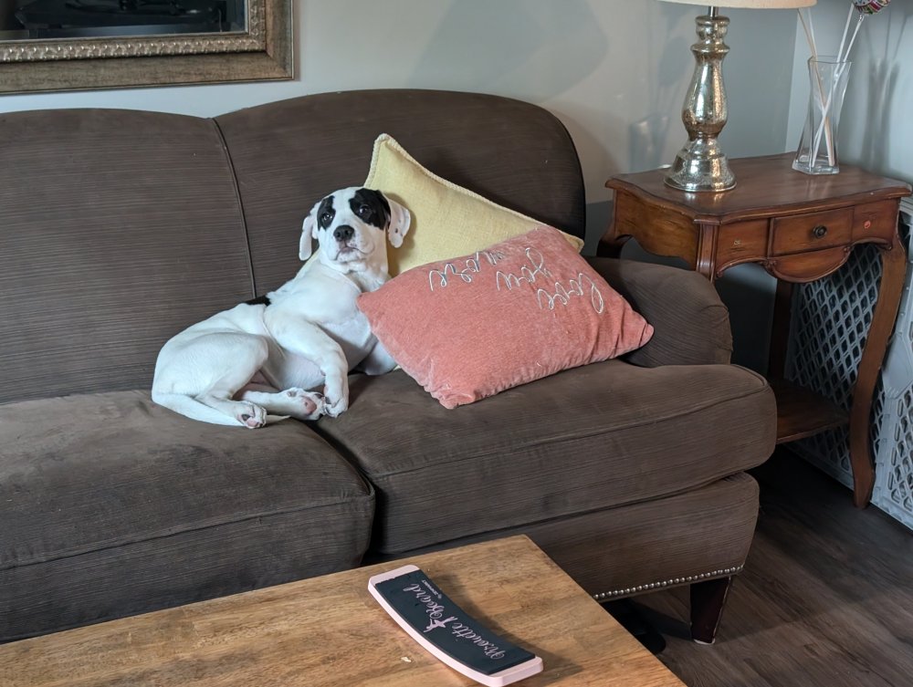Trixie figured out how to go down the steps to the basement and up the steps to the upstairs today. This is going to pose additional challenges but damn if it wasn't cute. Also the rescue sent all of the litter mates a group text and she is definitely the runt. Her two brothers are 38 and 45 lbs at about 14 weeks, her sister was at 30 2 weeks ago. We have a vet appointment in the AM but I'm guessing Trix is around 30 lbs. These are some big pups. Hopefully going to have a playdate soon. -
