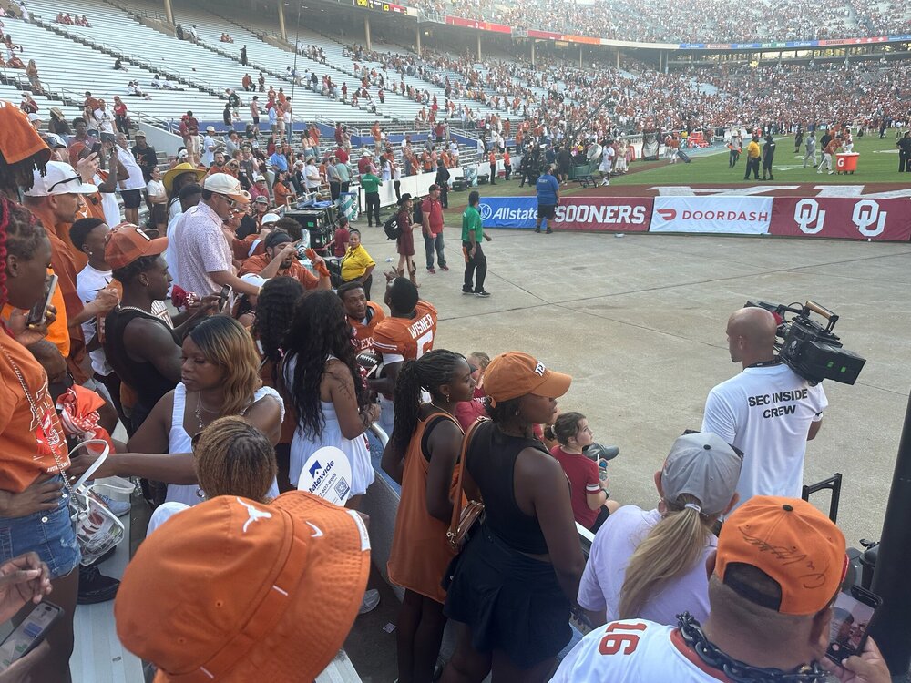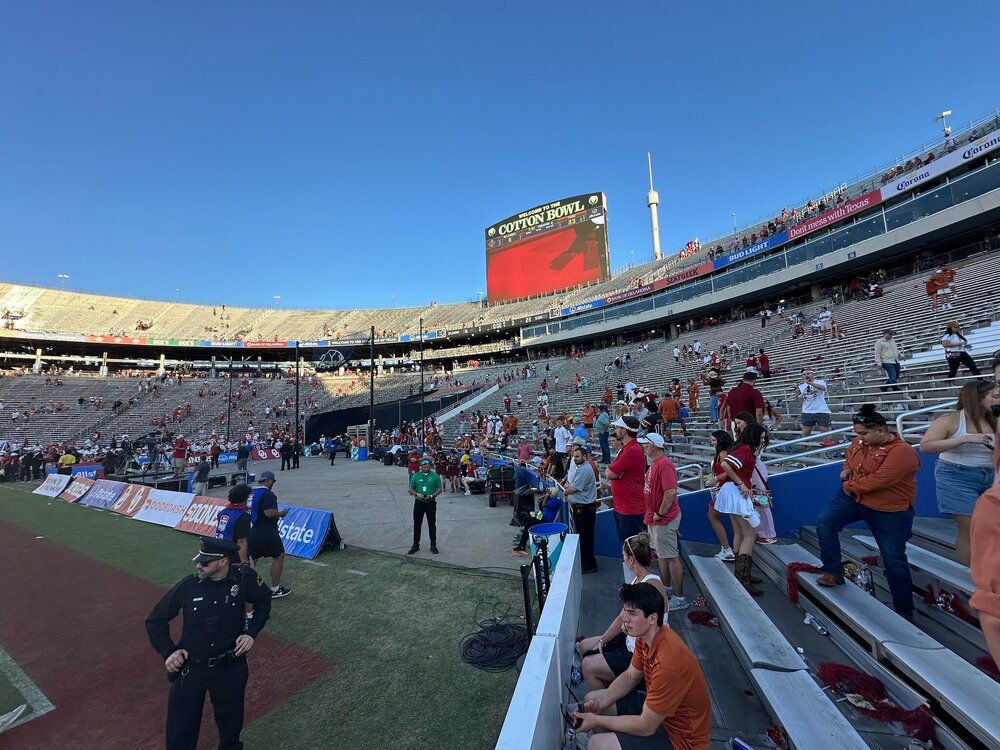 I will say that you could feel our fan base was on edge pregame. OU chants were generally louder, though nobody that I interacted with on either side was overly confident. That punt return TD broke it all loose though and the celebrations matched. A funny thing was that the area we were at in the fair had two big screens with a 15 second desync between them. We were in the middle so we could watch both. The left screen was the one that was behind and also the one with the rowdier crowd of mostly OU fans. So we watch the punt return on the right, go crazy jumping around with some other Texas fans, then get to turn around and watch it again on the left, complete with sad sooner reactions. From there the day was just glorious.