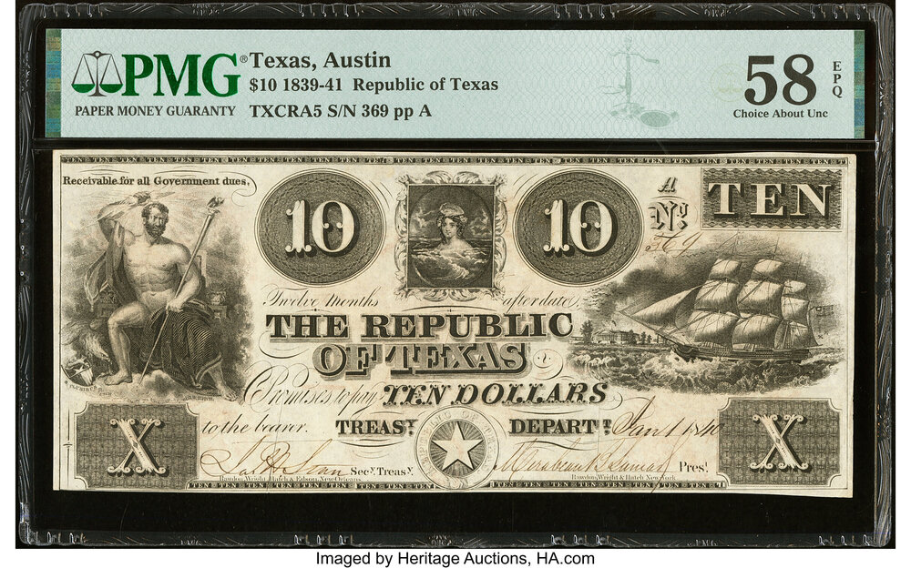 These cuts were indeed made when the notes were turned in for redemption, which meant gold back in those days. The Republic of Texas did everything they could to default on these obligations, and avoided redeeming them. As a result, these sold on the market for just a few cents on the dollar, to any speculator who wanted to bet on them being paid eventually. When Texas joined the Union, the USA figured that it was not acceptable to default on obligations of what would now be part of the Union, and the money (gold!) was found to finally redeem them, and the speculators came out very well in the end. Nearly all of these are cancelled, but not all the cancellations had a piece cut out like that, the nicest ones just had the cuts in the note, but not into multiple parts, or pieces removed, etc. A really nice one is coming up for sale in a couple weeks, this shows the full note design. https://currency.ha.com/itm/obsoletes-by-state/texas/austin-tx-republic-of-texas-10-jan-1-1840-cr-a5-medlar-25-pmg-choice-about-unc-58-epq/a/3599-20137.s -