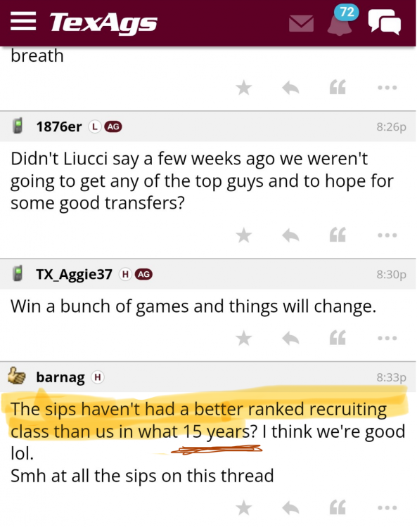 Going back 15 years 2025-2011 per 247 Texas had better classes 9 times in: 11, 12, 15, 16, 18, 19, 23, 24, and currently 25 aggy had better classes 6 times: 2013 & 2014 (FUPM>Strong transition class along with aggy getting a post move SEC and JFF heisman bump) 2017 (Strong>Herman transition class) 2020-2022 (Herman>Sark transition, Jimbo post Orange Bowl win and the bagman’s last hurrah) -