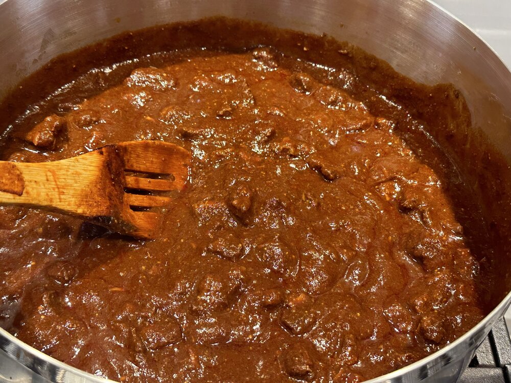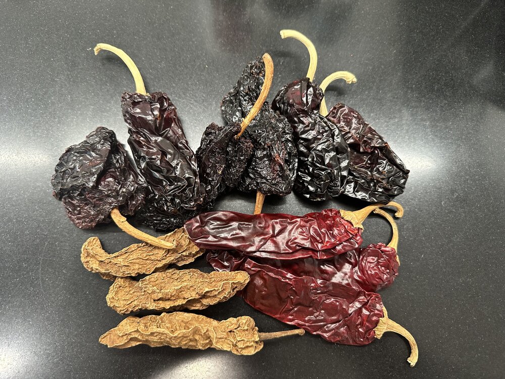 12. 3 guajillo, 6 ancho, and 3 chipotle. I like the ratio/flavor, but it’s too mild. Next time, I’ll try 4/8/4.