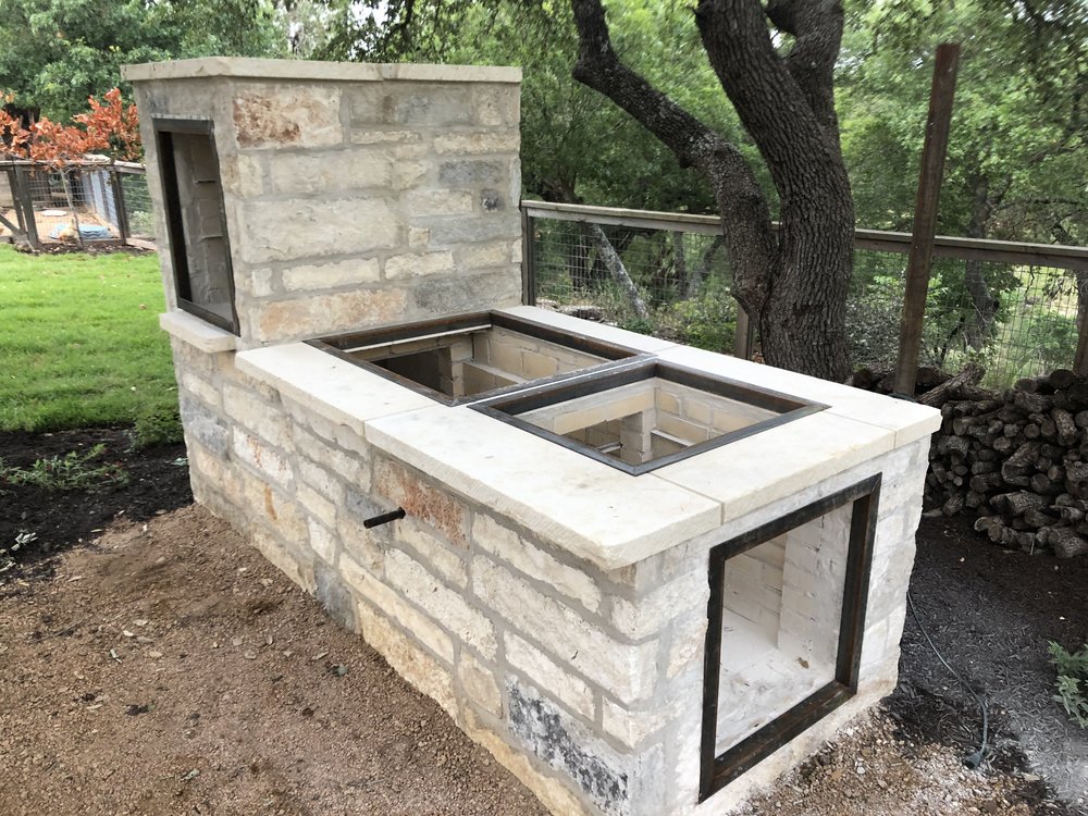Mostly finished up the pit this weekend with some help from a few buddies. I had the doors cut by my fab guy. I screwed up on the fire box door dimensions, so had to get those re-cut at the last minute. Everything went pretty smoothly, but we ran into a few issues along the way. I'd do about a dozen things differently if I did it over again, but all-in-all, I'm super stoked. Broke it in with some chicken and sausage Saturday night, then a pork butt and a whole turkey breast yesterday. Takes a while to get up to temp, but holds heat really well. I do have some smoke leakage and some of the exterior stonework has already cracked despite the fire brick liner. I need to go back and patch some areas with refractory mortar. Biggest issue is the counterweight for the larger door isn't heavy enough. I'm going to have to add a second weight. -