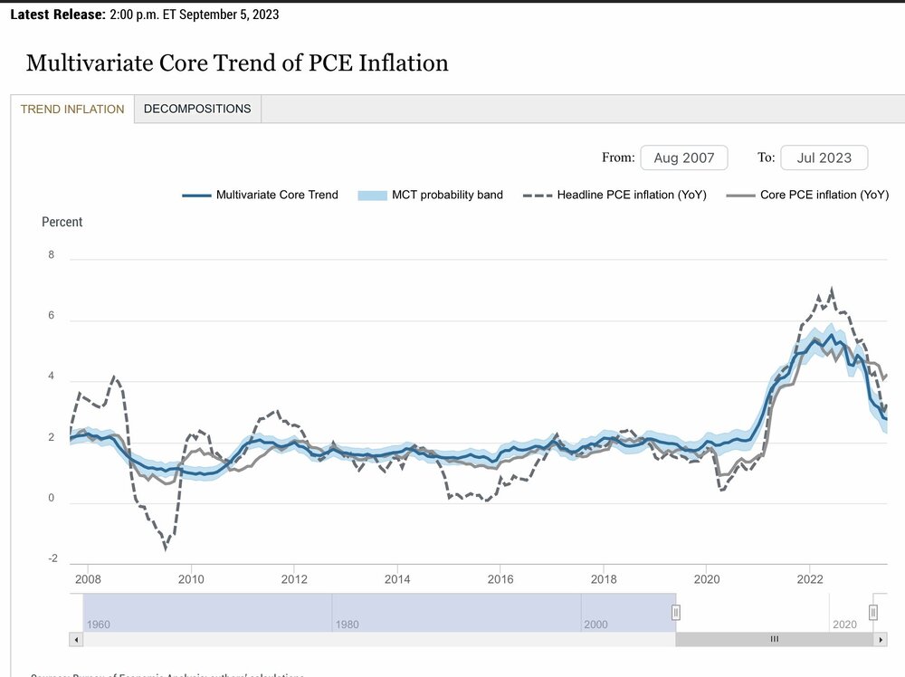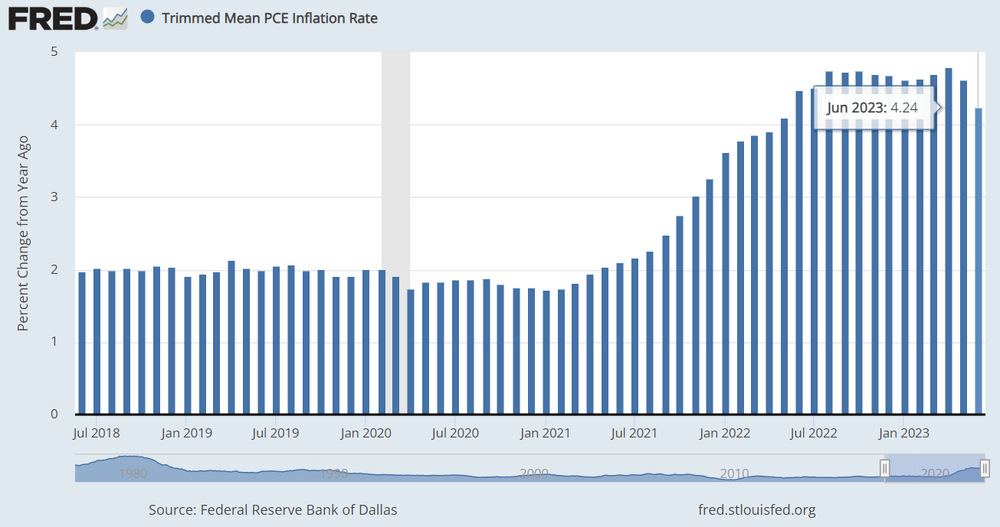 9. Trimmed mean PCE inflation at 4.24% annualized for June from the Dallas Fed. Trimmed = removing the most extreme increases and decreases—similar to removing outliers as inflation rolls through different sectors. The delayed effect of interest rate increases are beginning to rattle through the economy. The tricky part is determining when to pause or lower rates. Hold the rate too high for too long and the economy stalls.