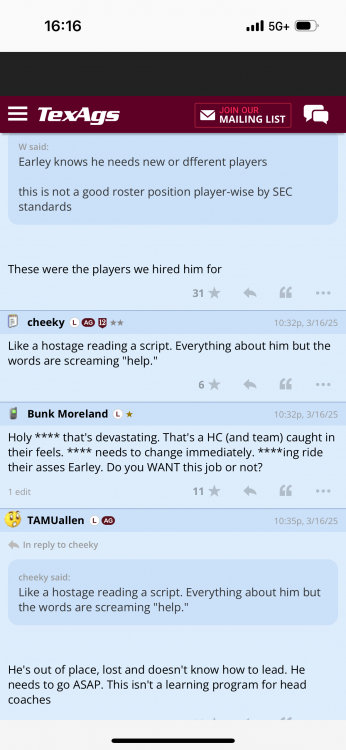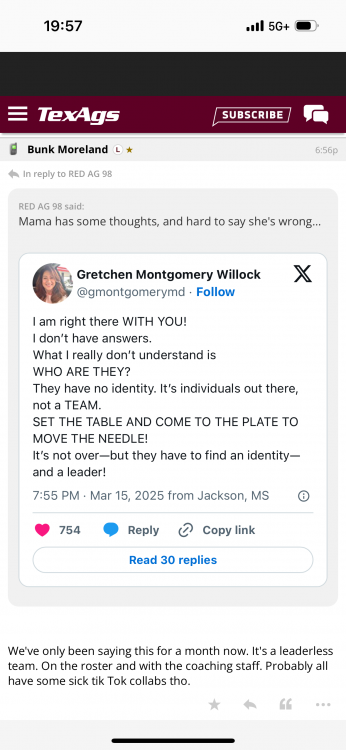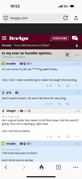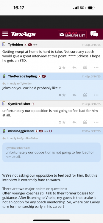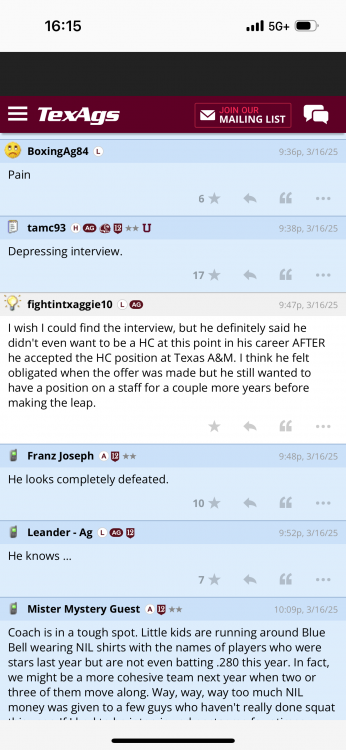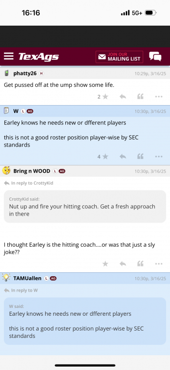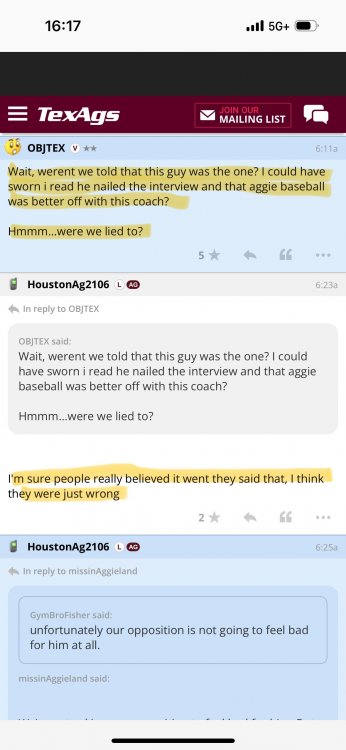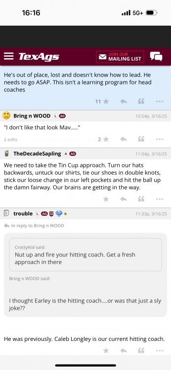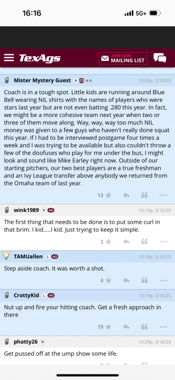 Out of the top 25 in Baseball America. https://www.baseballamerica.com/stories/college-baseball-top-25-rankings/# Two snippets: Three teamsβpreseason No. 1 Texas A&M (10-9; 0-3 SEC), Mississippi State (13-7; 0-3 SEC) and UC Santa Barbara (15-4; 4-2 Big West)βfell out of the Top 25. 5. Texas Previous ranking: No. 9 Last week: 4-0 Overall: 17-1, 3-0 in SEC (4-0 vs. Top 25) Weekend record: 5-0 Results March 11: UT Arlington; W 7-4 March 14: @ No. 22 Mississippi State; W 8-7 March 15: @ No. 22 Mississippi State; W 5-3 March 16: @ No. 22 Mississippi State; W 4-1 Upcoming March 18: UTSA March 21: No. 2 LSU March 22: No. 2 LSU March 23: No. 2 LSU Texas has won 17 consecutive games following a midweek win over UT-Arlington and a weekend sweep at then-No. 22 Mississippi State in its first-ever SEC series. Catcher Rylan Galvan homered three times and drove in four over the weekend and righty Max Grubbs earned his fourth save of the year on Sunday with 3.1 scoreless innings. Texas head coach Jim Schlossnagle has brought with him a great deal of early success in his first season in Arlington*, though the groupβs momentum will be tested this week with a midweek matchup against a solid UTSA team and weekend series at home against No. 2 LSU. *I did not know the flagship UT had moved to Arlington.