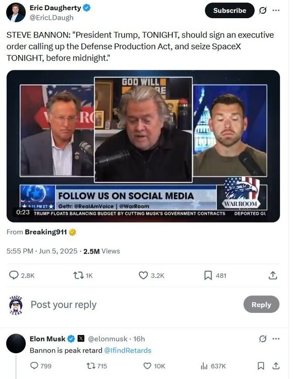 11. SIAP, but Bannon advocating that the government seize a private company simply because the President is mad at the CEO is the kind of comedy I'm here for. Also, Elon's response.