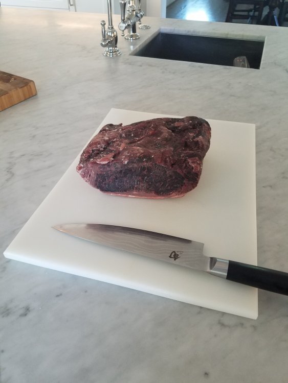 18. Here's the 30-day. It was funky, but not in a bad way (I can't find the cooked pics). Just a very powerful aroma and flavor. Also, I started with a 5lb hunk and ended up with a 18oz (1.1 lbs) steak. Unbeknownst to me there was a slice (puncture) in one side of the meat that went in about 4 inches. One whole side had "rot" from the inside and I had to discard it. Still a fun experiment. Week 2ish Week 3ish