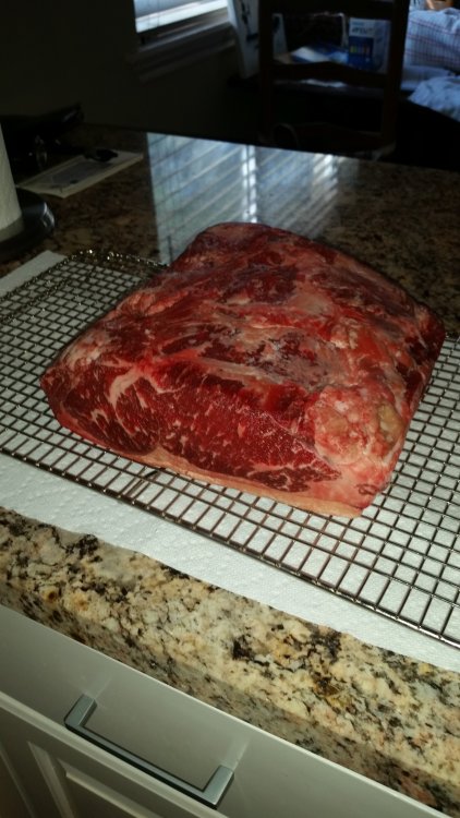 19. I've never used bags and usually put it on a rack in the garage fridge (doesn't see regular opening/closing). As you can see I've used salt blocks but I can't say they make a difference (nothing scientific to back up my thought). I have found the meat dries out pretty quickly and about 14 days is the most I want to go. The most I've done is about 30 days (might have been 35, I don't remember) and that meat was delicious in a bleu cheese way. Too rich and funky to eat a whole steak. Pics 14-Day strip. Ready for slicing Sliced Money shot - This steak was just awesome. Deep rich beefy flavor and very tender.