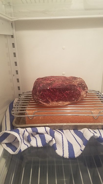 17. Here's what I currently have working: 14lb choice strip. I'm going to check it after a week and see what we've got. No fancy bags, and just some coarse salt on the bottom of the pan... why not? This is after 5 days and you can see how dark it's already getting. Open aging is much much quicker than the bag.