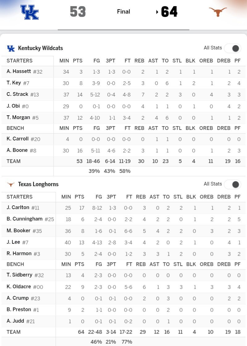 Seems like bad offense for Texas is now carrying over to the defensive side of the ball... gotta start spending more time in practice on offense. Also, this team really sucks at inbounding the ball after a foul, turnover, or timeout... that's a Vic problem.