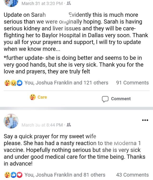 12. The Moderna shot almost killed a good friend's wife. She is 36 or 37 and in great health...or was. I'm not sure if it was 2 or 3 days ago, but her kidneys and liver began to fail and they had to move her from Tyler to Baylor medical in Dallas. She finally showed improvement yesterday and not yet out of the woods but it looks like she is going to live.