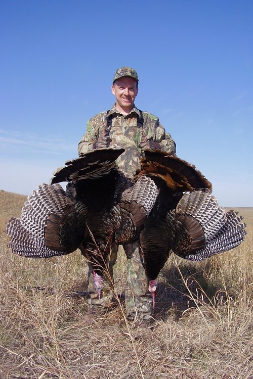 The first member of the "40 pound club". In order to qualify, one has to fill both turkey permits and the total has to reach or exceed 40 pounds. My cousin Bill here has done it twice, my brother once, and my uncle once and my other uncle once. Not me...