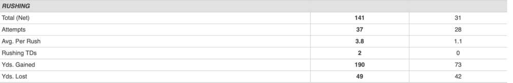 8. Sure, he is also 117 for 182 with 1497 yards 7 TDs and 3 INTs. That is a 64% completion rate with and average of 374 yards a game. Something tells me there may be an underlying issue resulting in the losses. Out of those 4 games the one we won, we out rushed our opponent. 18 rushes for 51 yards-2.8 average=L 40 rushes for 198 yards-5.0 average=W 31 rushes for 102 yards - 3.3 average=L 23 rushes for 31 yards-1.1 average =L Big Humans matter, run the football, everything else takes care of itself.