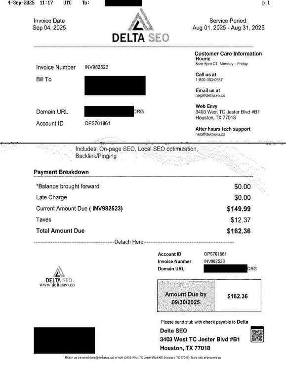 15. We have to continue to use faxes here, so years ago we migrated to a fax server. The amount of scams that come through are staggering. All of them are tossed by the ladies that receive the faxes, but this one slipped through and was sent to the business office for payment. This one made me chortle loudly: $149.99/per month, but that includes "backlink pinging" https://deltaseo.co/ And the address? Here's 3403 West TC Jester Blvd Houston: