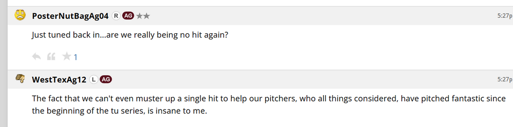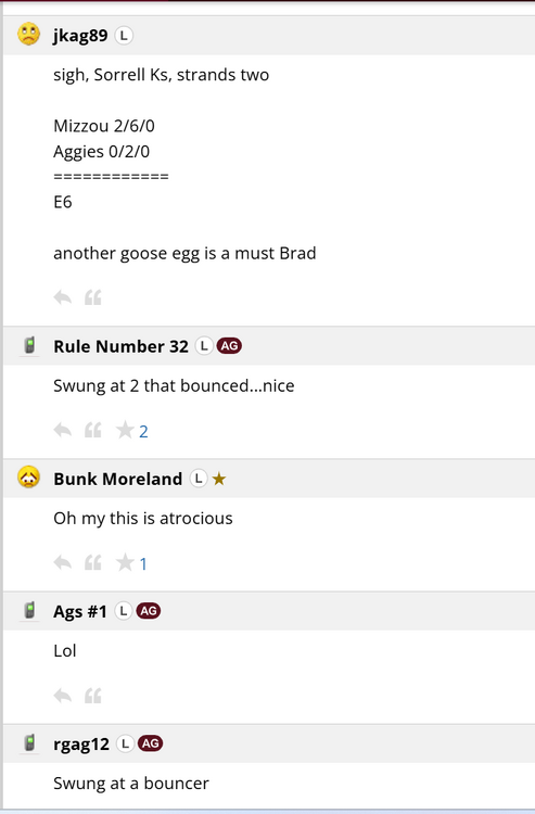 Checked in on the TexAgs game thread for today: ETA; I'll keep adding so long as it's interesting. Man, they get Aggie rollercoasters in a single inning: That was a particularly nice moment to check on baseball. -