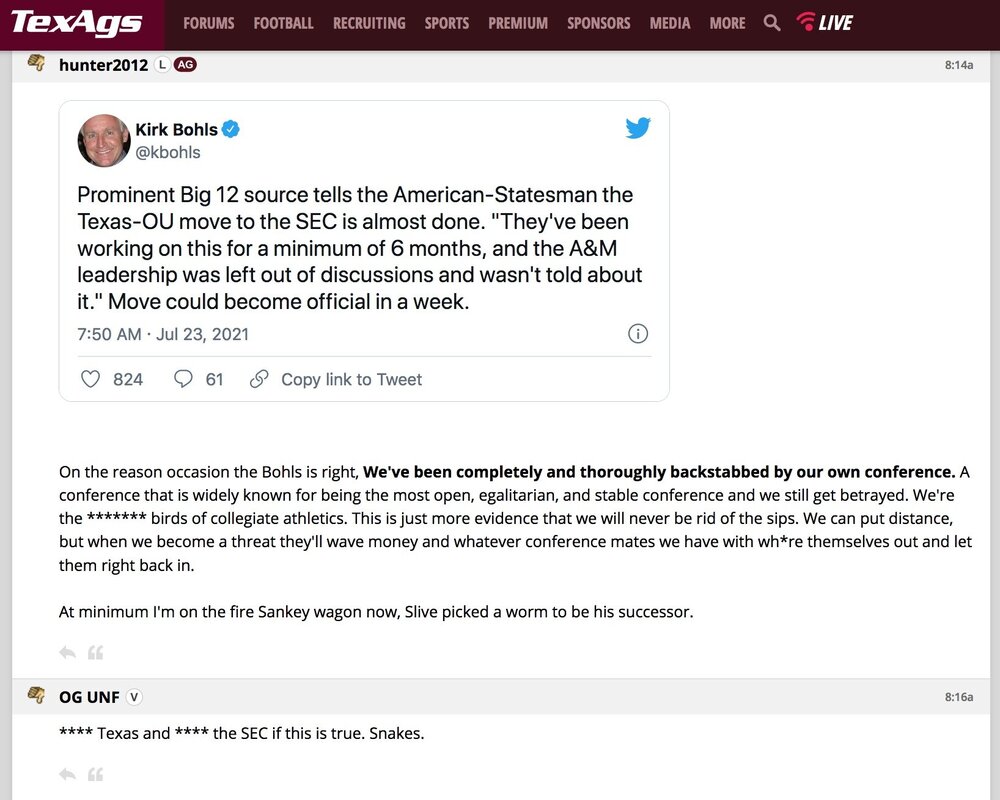 “If would be shocked if this is true. A&M would probably sue the **** out of the conference if something this massive was kept in the dark on purpose” https://texags.com/forums/5/topics/3211187/2#discussion