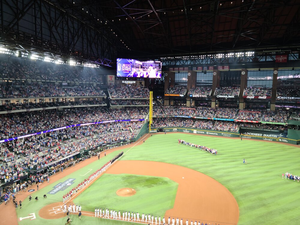 20. Last night was nuts and definitely tops the environment from game 3 of the ALDS. My ears were ringing after the Corey Seager home run. Loudest I've ever heard the ballpark, even with the Adolis walk off. Tonight should be even more fun. Just a heads up if any of you are going to the ballpark: be prepared to wait. Food AND merch lines were extremely long. We made it to the ballpark around 5:15 and after visiting the grand slam shop and food we didn't get to our seats until 6:45.