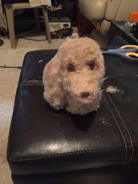 21. So, on a similar note, I have a related story involving dog likenesses. when I was dating my wife in college, her grandparents had a mini poodle named Bitzee. Bitzee was the type of dog only loved by her owners, typical small poodle syndrome. Not long after, Bitzee died of old age. A number of years later, my parents were visiting my wife’s grandparents ranch with us, and her grandfather was giving my parents a tour of his woodworking shop. As part of the tour, he pointed out something he had made… He had carved a wooden effigy of Bitzee, and had glued some of Bitzee’s actual fur from one of her last haircuts to it. No one else in the family knew. America, meet the effigy of Bitzee the miniature poodle (one of the ears had fallen off.