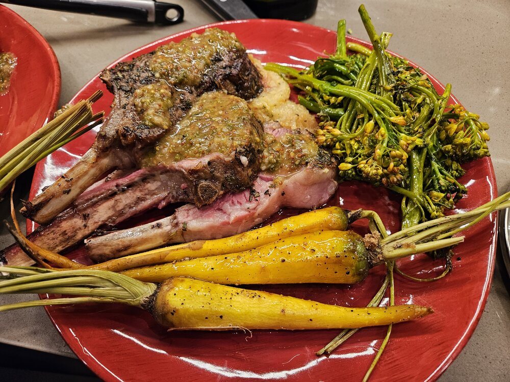 2. Herb crusted rack of lamb with a mint mustard sauce. Over polenta. Brown sugar and butter glazed carrot. Fried brochollini. Slammed. Happy Thanksgiving you fucking assholes!