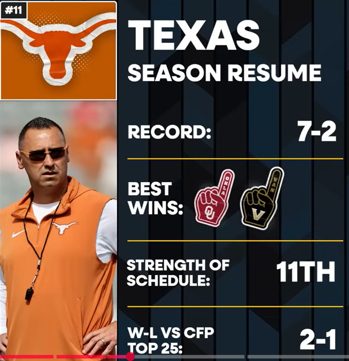 why are you being a pussy? you need to calm down. 9-3 Texas is in. we're Texas, Arch, eyeballs, our SOS, blah blah blah. you said it precisely, but everyone who is saying not so fast on Texas 9-3 is meaning exactly what you are saying. it's a bottomline fact, 10-2 texas is in. 9-3 maybe, maybe not with way too many variables to predict even with only 4 weeks left.