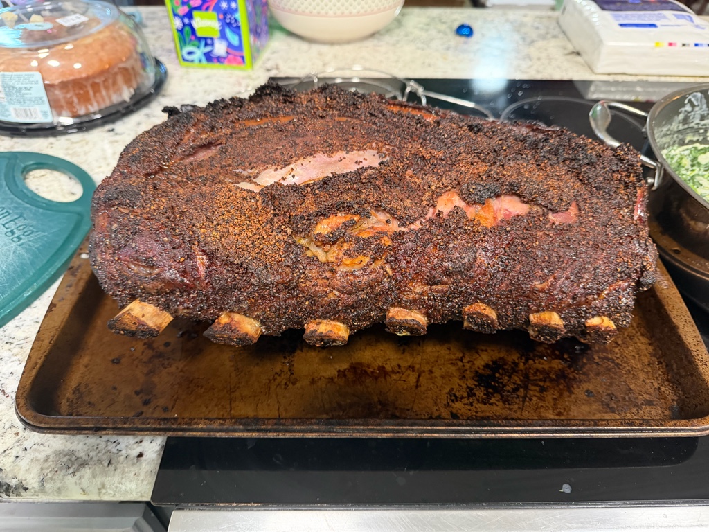 Total time on the BGE was 4 hours at 250. Pulled at 125, rested for 30 minutes, wrapped , toweled and put in a Yeti for 2 hours then 15 minutes in a 500 oven. 11 of us killed it. 3 slices left over.