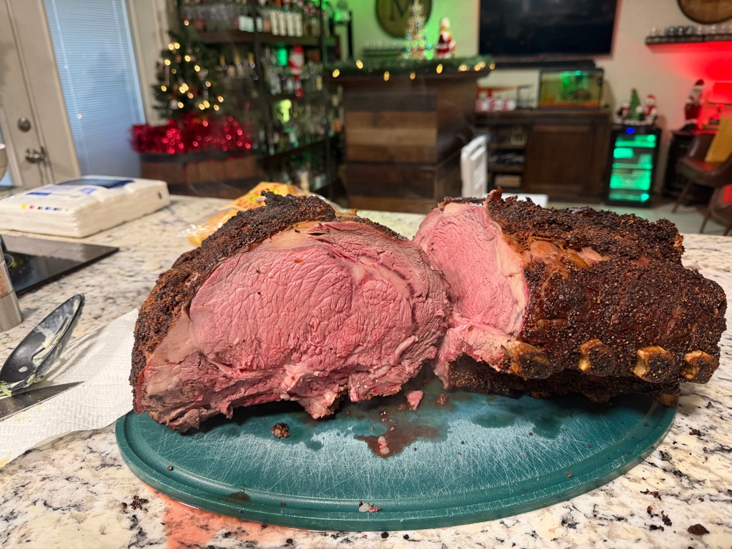 I started it (17 lber) at 8 this morning in the oven at 200. 4 hours later it was 110 and had to take it on the road..Wrapped it for transport 35 min away to my parent's house. Put it back in at 200 degrees at my mom's. Took it to 128 in the coolest spot, rested loosely covered for 30 min while turning the oven up to 550 and blasted for 8 minutes. Turned out good. Pregame, wrapping for the ride, packed away, carved and plated.