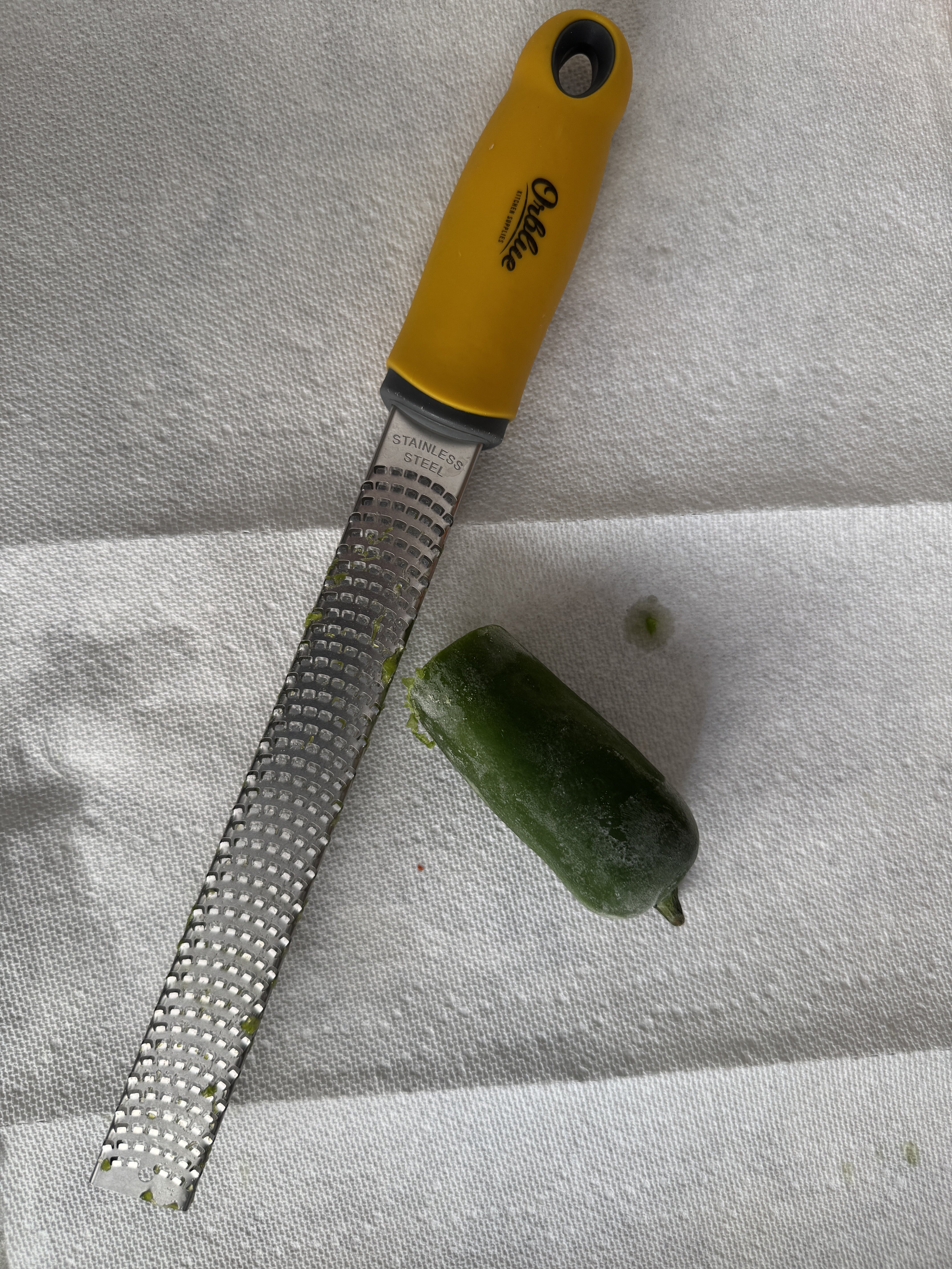 I couldn’t find the gadget thread. So here. This hack improves lots of things. put jalapeno in freezer til hard as a rock. Apply to the micro plane and make jalapeno snow. Quite tasty.
