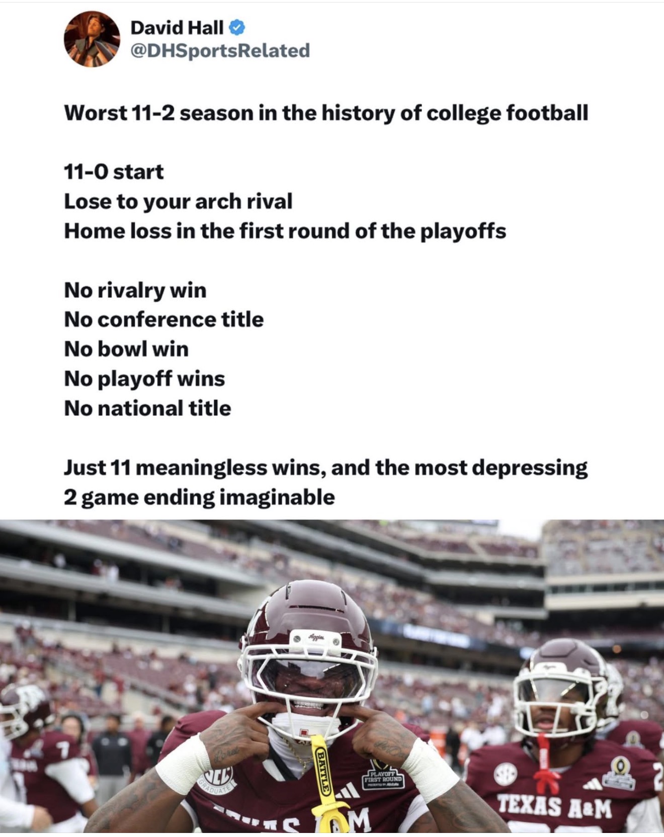 Given the totality of their personnel losses heading into the portal period, plus what they’ve spent on this 2026 class, there’s almost no way they have enough to spend in the portal for what it would take to reload. The money guys are not stupid for ATM and Elko isn’t either. I wouldn’t be surprised if they’re telling themselves that they’ll develop the youth, be smart and picky in the portal and regroup with an 8-4 season that catapults them back to the playoffs in 2027. They were gifted an unbelievable schedule this year. They get the two gifts in South Bend with the dropped XP and the flagrant holding no-call. Then, they face Auburn, Florida, Arkansas, and LSU all right in the midst of structural program collapse. Missouri with a 3rd string true freshman QB and whatever the fuck was going on with South Carolina’s program this year. Just insane shit where opponents were committing suicide in front of them at every turn. Next year, no way that happens. The 2026 schedule and their personnel losses guarantee nothing regarding 8-4 or better but they think that’s their absolute floor. -