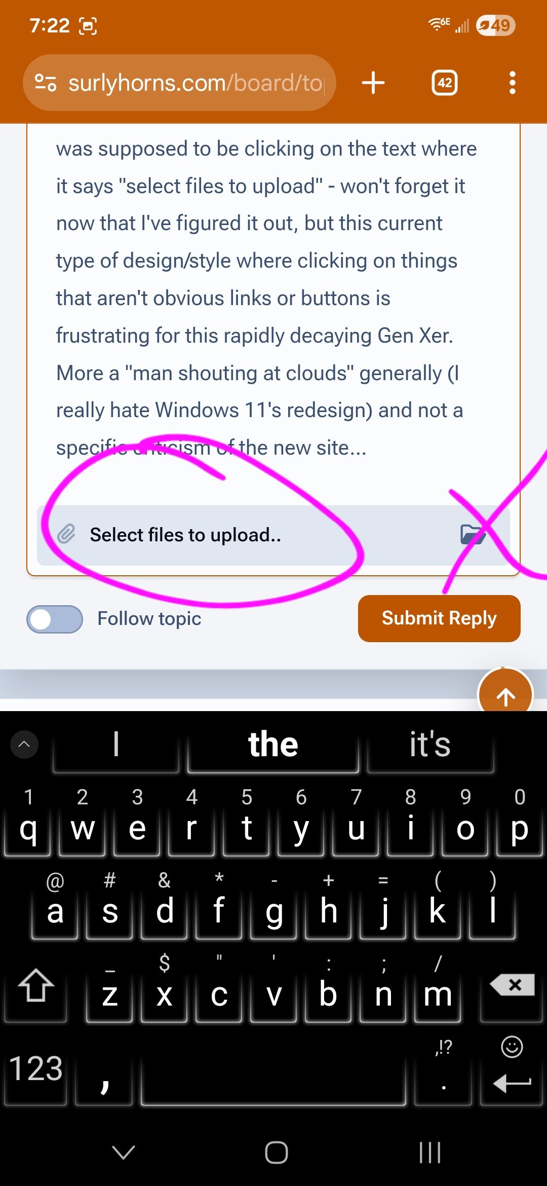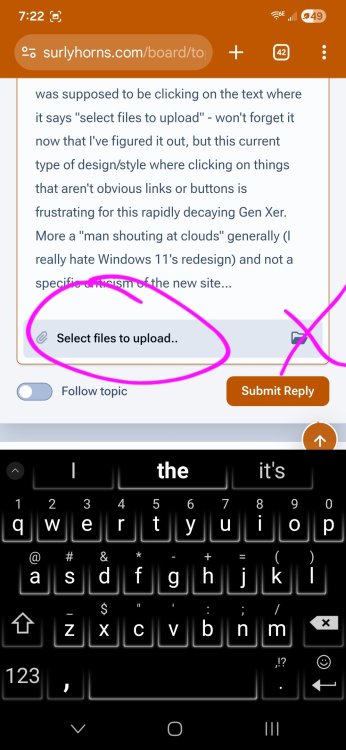 Is it me, or has the site been slow as shit for the past hour or hour and a half? This is the first time I have been able to get this page to load since my earlier post. The issue I had where I thought I could only upload previous attachments was because I was clicking on this folder, not realizing that I was supposed to be clicking on the text where it says "select files to upload" - won't forget it now that I've figured it out, but this current type of design/style where clicking on things that aren't obvious links or buttons is frustrating for this rapidly decaying Gen Xer. More a "man shouting at clouds" generally (I really hate Windows 11's redesign) and not a specific criticism of the new site...- NFL Week 17; Christmas-style