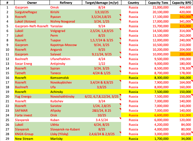 Kudo's to this guy for trying to keep track of all this. Most of the first hand information is suspect, and trying to compile it and process the information and boil it down into something useful is difficult at best. Even then, that summary would probably only get you a C+ or a B-. The screenshot tells you all you need to know. "Chicks dig the long ball big fires." Not unlike the Japanese carriers on fire at Midway, and we know how that turned out. Ukraine's systematic targeting of Russian refining capacity is mind boggling. The refining capacity of the 3rd largest oil producer in the world is on life support, and Russia is now importing refined products for the first time in 20+ years. Of Russia's 28 largest refineries (over 50,000 bbl/day) , Ukraine has hit 20 of them in 2025, and all but the 3 refineries in far eastern Russia have been hit since 2022/ The recent strikes targeted the specific refining towers that are the most critical pieces of equipment, and it appears they have destroyed those targets, in a way that those units would not be repaired or replaced for at least a year, if not longer. The blast from the initial explosion, and the resulting fire and heat would melt most of the wiring and cables, and the measurement, instrumentation and control equipment necessary to operate the facility. They probably couldn't get replacement parts, and don't have the money for the newer and better equipment, if anybody would sell it to them (they would). Replacing the Chevron's refinery in California would probably take 2+ years, without the impacts from sanctions on critical equipment. There are multiple layers of skilled labor required for the many tasks required, and most of the Russian skilled labor Russia had are probably dead, or gone. My summary below. Everything in red damaged in the last 3 years, the green damaged in 2025. The yellow are the 3 undamaged refineries. The 4th undamaged refinery (Orsk) just got hit this week.