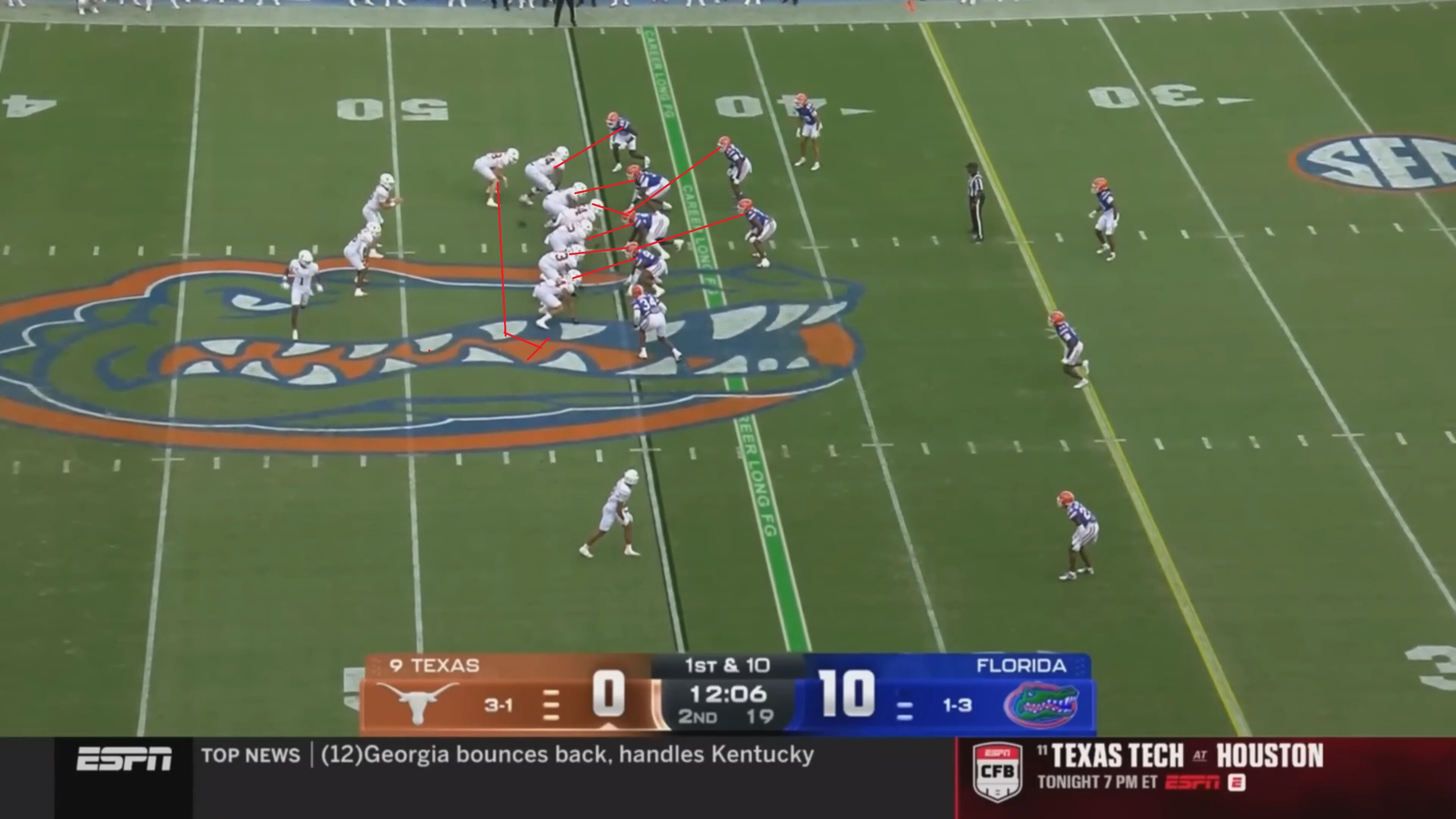 Whether we run Inside Zone or Outside Zone, when we play the smaller, quicker fronts their players seem to beat us to our spots. So for example with inside zone the linemen fire off the ball and depending where the D-line is lined up the linemen have certain assignments. There are usually more blockers than D-linemen. So for example there is a defensive tackle between the center and guard. At snap both the center and guard will fire off the ball and combo block the DT. Then the guard will leave the center solo and continue on to the second level to get hands on a linebacker. Now this is all determined by what type of front you are faced with. Sometimes the guard will be left to handle the DT while the center moves on to the second level. Anywho, when we try to run it a few different things happen. Sometimes the linemen are slow getting to the second level and end up whiffing on the guy they needed to block, who shoots past them and blows the play up at the line of scrimmage. Sometimes the guard who is left 1v1 with a DT gets overpowered and pushed into the backfield causing the RB to have to stop his momentum and reroute, which gives the other defenders time to rally to the ball. So then what has to happen is the line has to maintain the doubleteam which allows the LBs to roam free and just scrape over the top of the play and meet the back wherever they are going. If you just take some plays and watch the line its like Keystone cops. On any given play linemen are missing blocks, falling down, or just getting bullied backwards. Been going on for years now. So let me give you an example below. We are going to run a variation of Inside Zone called Split Zone. In Split Zone the H back or Tight end fires across the formation to cut off the backside pursuit creating a natural cutback lane. Below is how it should be blocked vs the 5 man front Florida is in. You can see the TE at the top of the screen is supposed to come across the formation and kick out the backside DE. The OT has the DE. The LG has the DT in his B gap. The Center and RG are supposed to combo block the NT with the center trying to reach the playside LB. Then the RT and other TE combo block the DT in the C gap and then work their way to the OLB. But here is what actually happens below. The TE tiptoes his way across the formation and blocks the backside DE, but because he was slow there is no cutback alley to run through. He needs to fly across with some aggression and a sense of urgency. OT has his man handled. Surprisingly so does the LG. Here is where it gets bad. The Center/RG are struggling with the NT and never come off him to get to the playside LB. The RT/TE combo is having communication errors. They fire off to doubleteam. The TE appears to be pushing him across the face of his RT, helping the defender into the backfield. Meanwhile the two LBs are just sitting there on the hole sipping a cup of joe waiting. Nobody has touched them. A comedy of errors. No one ever really came off a doubleteam, and we don't have breaking arm tackles, make your own yards kind of backs. So play gets a yard or two. IZ.mp4 Keystone cops. There are way worse but I'm lazy. There are many great run schemes out there. Gus Mahlzan comes to mind. But they recruit for their philosophy.