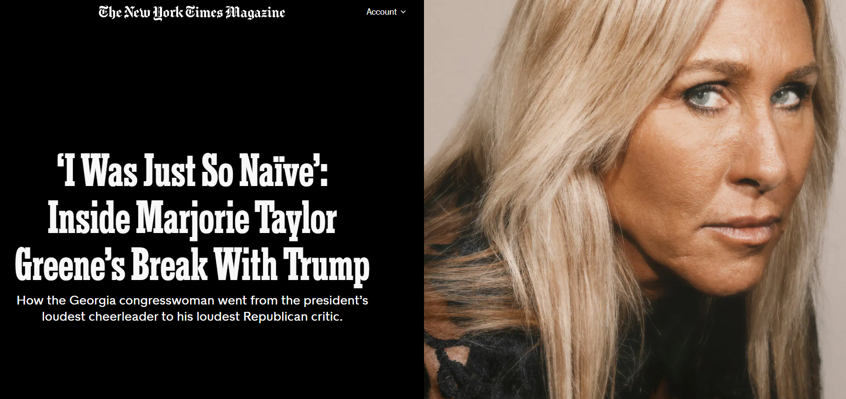 Not sure if anyone has the appetite to read such a long piece, but while this profile of MTG -- based on a couple of interviews and some really candid quotes from her -- doesn't exactly put her in a new light, it certainly answers a few questions. It's possible I'm a fool, but her decision to part with Trump over the last several months seems genuine after reading this. It also confirms my impression that she accurately reflects the views of well-off, middle-aged white women with Fox News Brain from culturally conservative small towns. In other words, she reminds me a whole lot of some I went to high school with and have kept in touch with since: entitled, arrogant, ignorant, conspiratorial-minded, but ultimately honest about who she is and what she (wrongly) believes in. While I loathe the shit that she's said and done, and therefore I'm unsympathetic to her being cast from Trump's good graces, she sounds oh-so-familiar to some of the conservative people I know who've lived their adult lives in the Fox News bubble, blindly believing everything the teevee bobbleheads have told her for the past 30 years. It's no wonder these people are always so angry and confused about shit when all they're told (and willingly listening to) is that "those people" are to blame for everything. And now that she's actually been exposed to trying to work with Trump -- as opposed to just fawning over him from afar -- the scales have fallen from her eyes, and she sees him for who he really is: a corrupt, self-serving asshole who's only loyal to himself. I think she may be a good, real-time reflection of the erosion in support we (Surly posters) have been observing anecdotally among our families and in our social circles. @atomheartbevo You've discussed this in several posts lately, so I'd like to hear your thoughts after you read it. No rush, though, because it is pretty long and worth stewing over for a bit. Definitely worth a read to get a better understanding of some of the turmoil going on within MAGA. https://www.nytimes.com/2025/12/29/magazine/marjorie-taylor-greene-trump-maga-split.html https://archive.is/zTlk0 - Quinn "La Joya" Ewers - The Man The Myth The Mullet, Now Starting for the Miami Dolphins