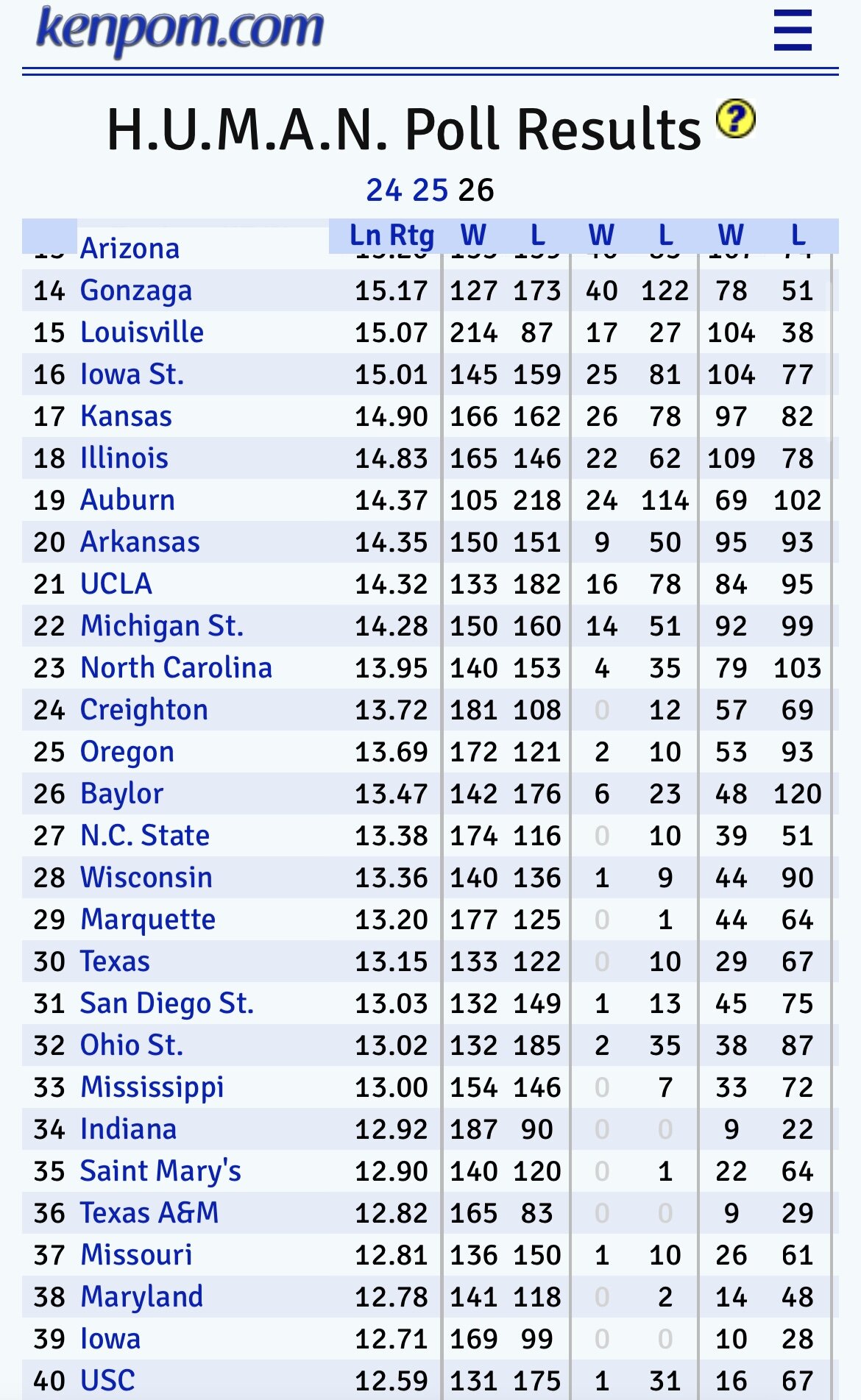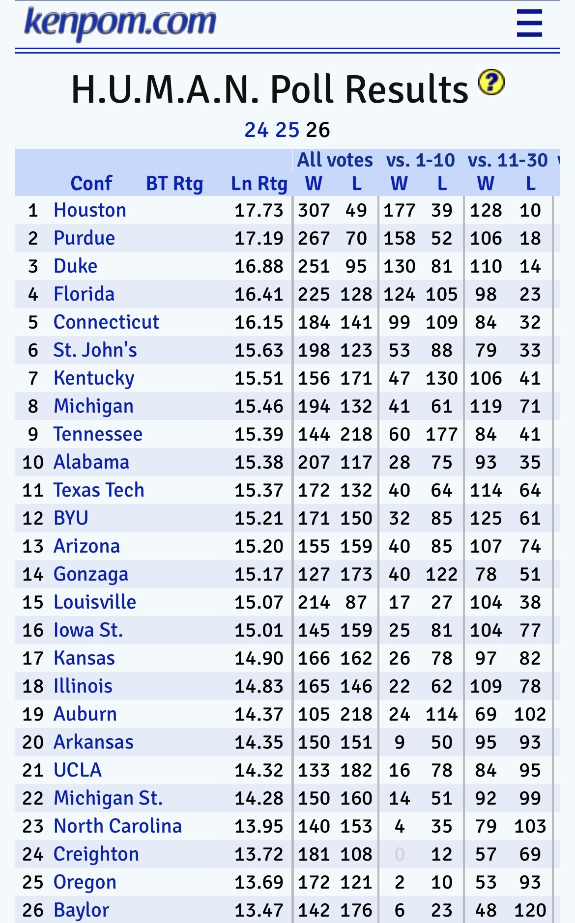 Voting for the H.U.M.A.N poll concluded Sunday night. Thanks to all who participated. In total, we received 29,522 votes from 632 voters. As is custom, we took all of these votes and ran a Bradley-Terry algorithm on it to produce a 1 to 365 ranking by humans, for humans. This year we changed two things about our approach in an attempt to improve poll output: The introduction of super-voters. If you finished in the top 50 of either of the previous two iterations of the poll, you earned double power in the voting.¹ There were 55 voters who took advantage of this. The best teams were more often matched up against the best teams. For instance, Houston was matched up against teams outside the H.U.M.A.N. poll top 30 just twice this season. Last year they had 35 matchups outside the top 30 (with fewer total votes). That should give us better data on the top teams. Like, very few people think Houston is outside the top ten this season. So there’s no reason to make people prove that. Actually, few people think they’re outside the top 1, except possibly a bunch of AP poll voters. That’s my way of saying that Houston was the clear choice for #1 by the humans, joining Kansas (2024) and UConn (2025) as previous #1’s. The Coogs will need to do better than those teams or we will officially have a H.U.M.A.N. poll curse to consider. The final results are here and the top ten is below. It’s a pretty sensible top ten! As you can see from the graphic, we provide two ratings for whatever it’s worth. The BT (Bradley-Terry) rating is the raw rating from the algorithm. You can use it to get an idea of how likely it is that one of our voters would pick one team over another. Using Houston's and Duke's ratings, we find that Houston would have a 70% chance of being picked over Duke by our electorate². You can click on a team to see all of their votes: Houston was picked 76.7% of the time against Duke in reality. The computer has to balance out all of the matchups, though. If future voters behaved like past voters, we’d expect them to be slightly less bullish on Houston in this matchup, based on all of their other votes. The other rating is the Ln rating, which transforms the BT rating to a linear scale so you can compare teams on the same scale. For instance the biggest gap in the ratings were between #364 and #365, and then #1 and #2. The next biggest gap was between #18 Illinois and #19 Auburn. If you think the humans are too low on Illinois and their band of Balkan-born ballers, the Illini are actually as close #9 as they are to #19. You won’t get that kind of information from the AP poll! (Neither the BT rating nor the Ln rating actually mean anything relative to my own ratings, however.) I’d say the poll’s results seem pretty reasonable at the top. Y’all seem to hate UCLA for whatever reason, and you love St. John’s. It does seem like humans really love Rick Pitino. And to be fair, UCLA was the team most valued by super-voters relative to regular voters. The team the voters disagreed on the most was Louisville, who finished a sensible 15th, but the details are wild. They received a win in a matchup against #1 Houston and a win from a super-voter against #2 Purdue, while also taking two losses to #48 Georgia, three losses to #49 SMU, and a loss to #64 Northwestern. Finally, we can infer conference ratings from your picks and - spoiler - the top 12 leagues are in the same order they’ll be in my preseason ratings. So we are in agreement on that. If you participated, you can find your ballot here. (We’ll eventually get past results on our brand new account page.) As the season progresses, we’ll update the ballot to show your correct picks, ultimately crowning the Champion Ball-Knower of the Year after the national championship game. Good luck! 1 Should there be a fourth iteration of the H.U.M.A.N. poll, we plan to keep the super-voter concept going. However, you will lose super-voter status if you finish in the bottom 50 of the final standings. 2 We take Houston’s BT rating of 2276 and Duke’s rating of 969.6 and plug it into a simple formula like so: 2276 / (2276+969.6) = .701